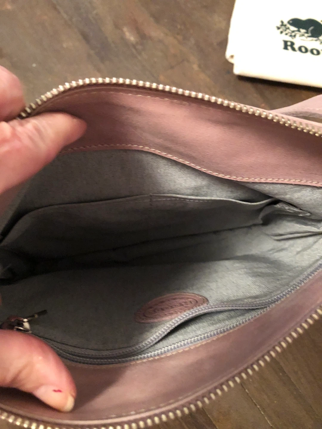 Here's a cute Roots crossbody bag in a lovely light pink colour! It's made of leather and comes with its original dust bag. It has a zip closure and a front pocket for easy access