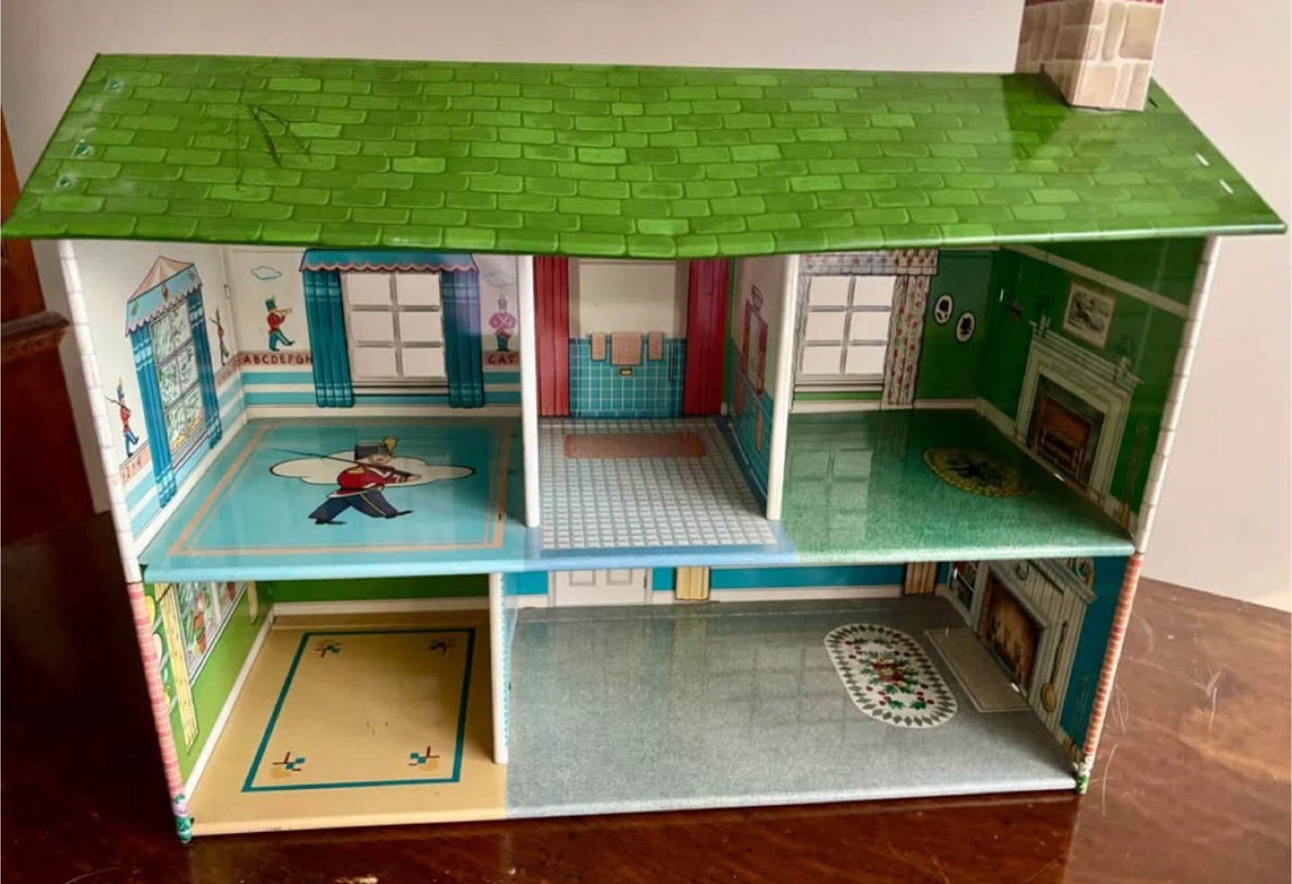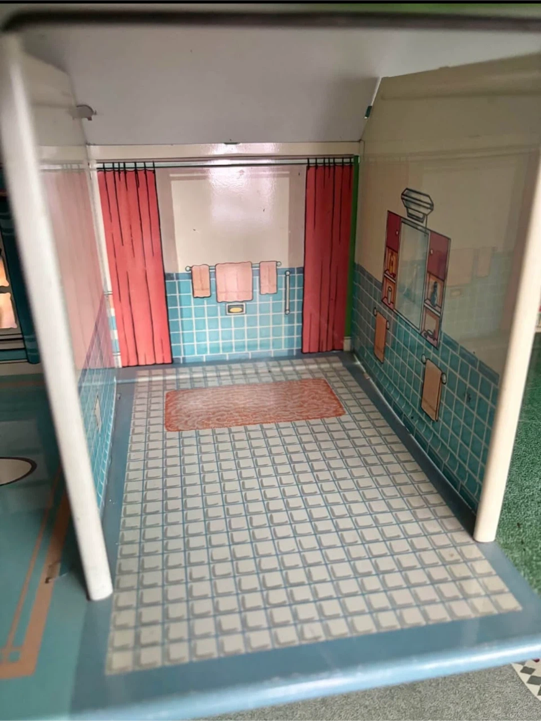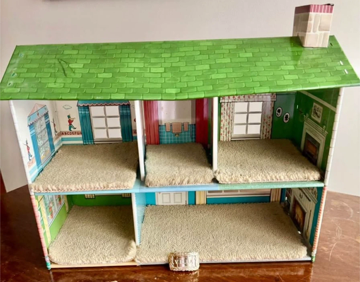Vintage MCM Tin Dollhouse 2 Story Style Litho 1950-1960s w/removable carpets. It's a charming dollhouse perfect for collectors or anyone who loves vintage toys. It's in great condition for its age and ready for a new home.