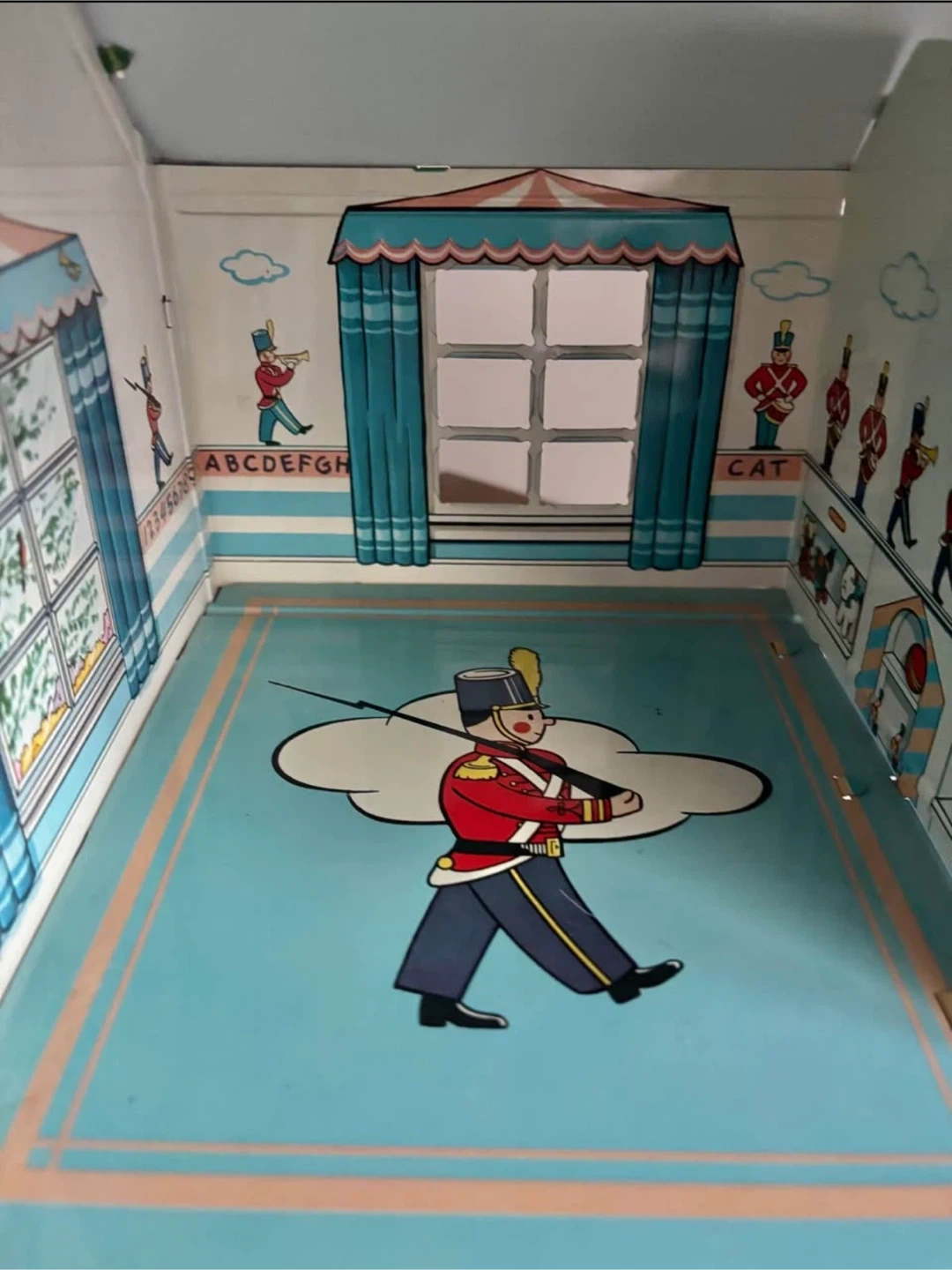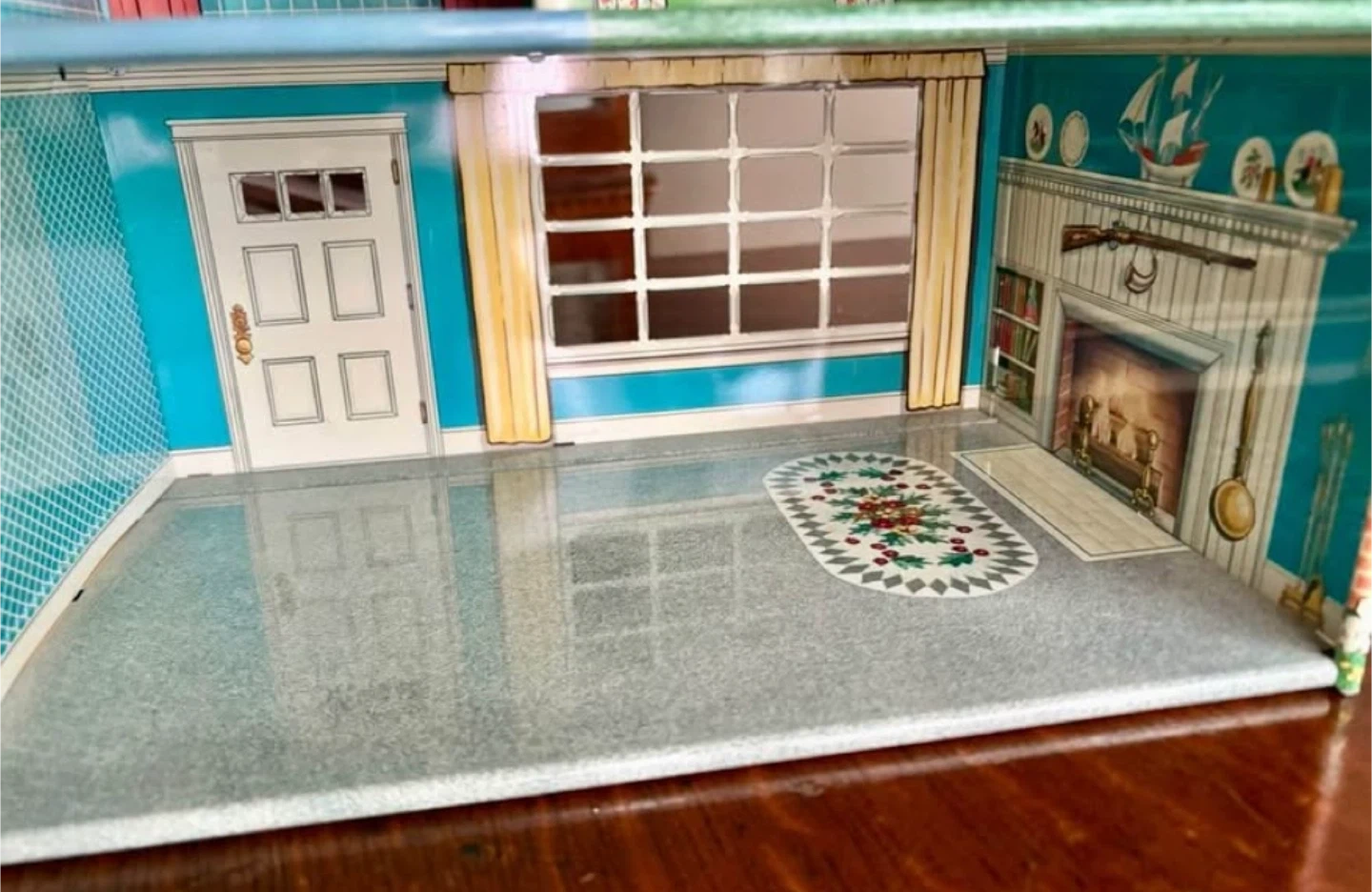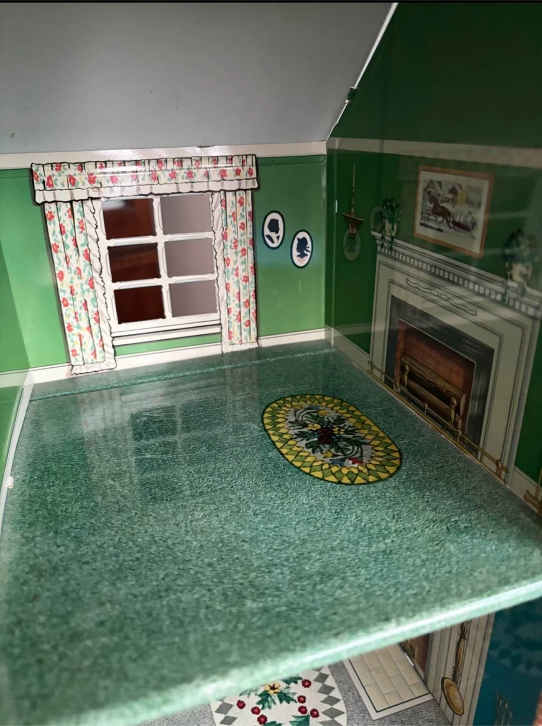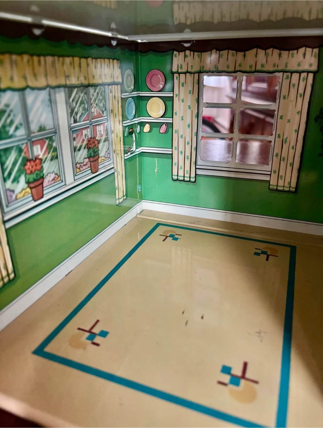 Vintage MCM Tin Dollhouse 2 Story Style Litho 1950-1960s w/removable carpets. It's a charming dollhouse perfect for collectors or anyone who loves vintage toys. It's in great condition for its age and ready for a new home.