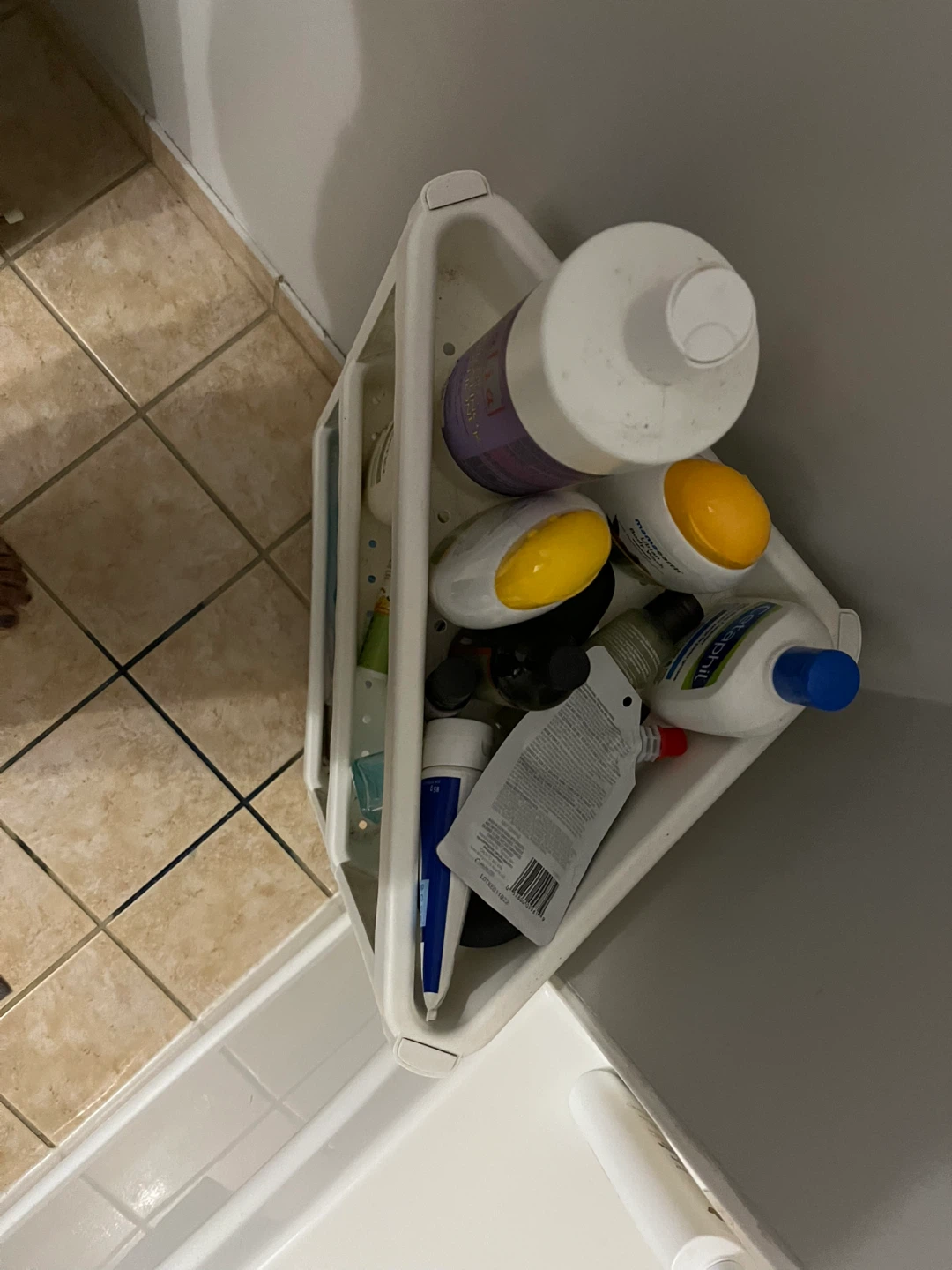 Here's a handy 3-tier corner shelf, perfect for organizing your bathroom or any corner of your home! It's white and in great shape, ready to hold all your essentials
