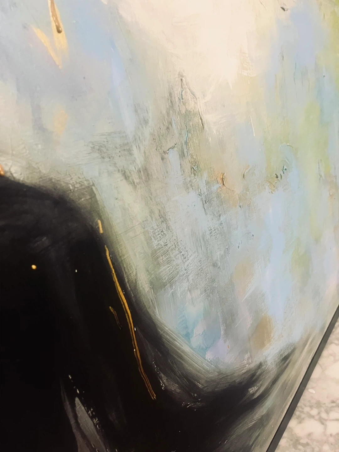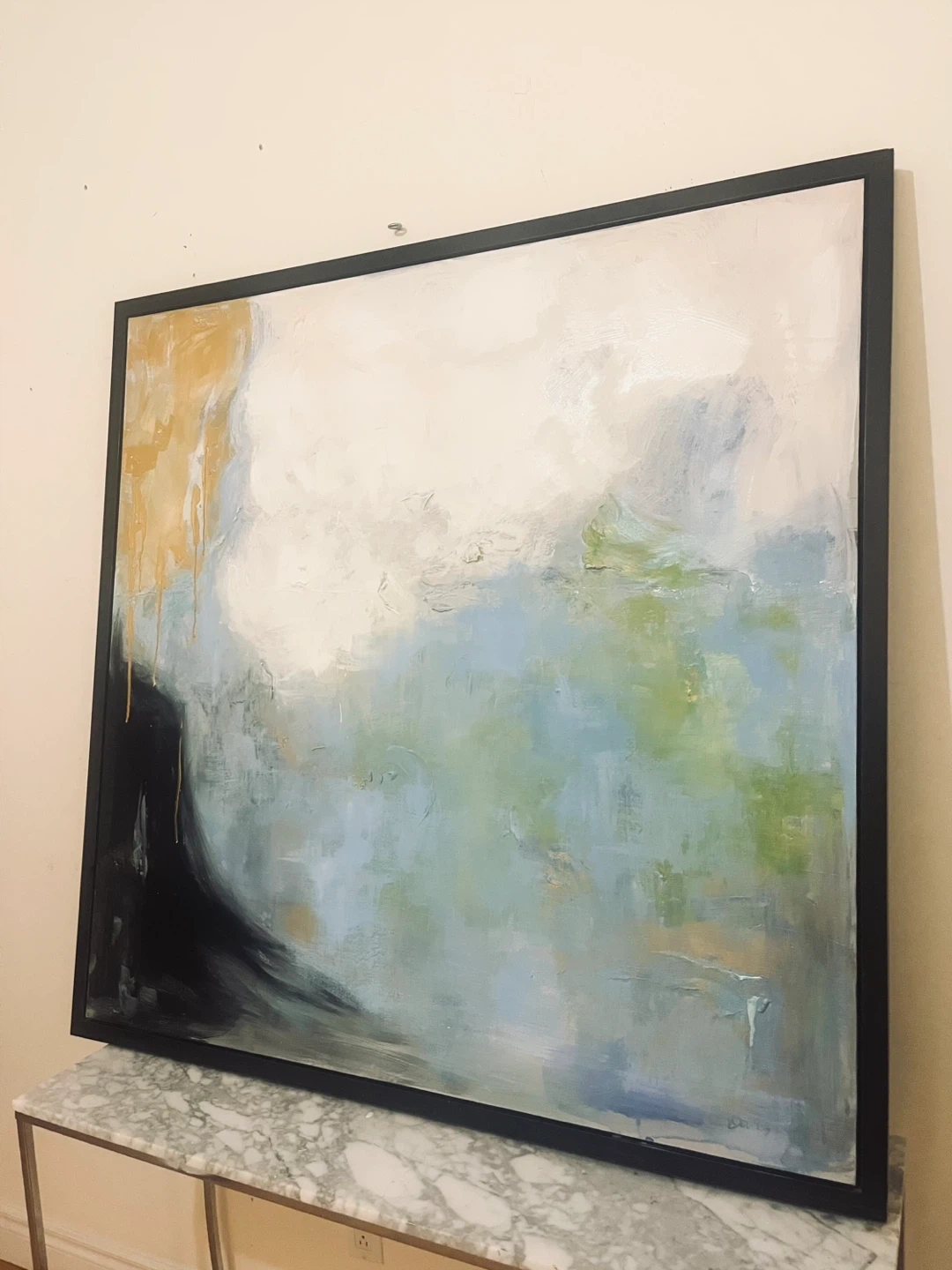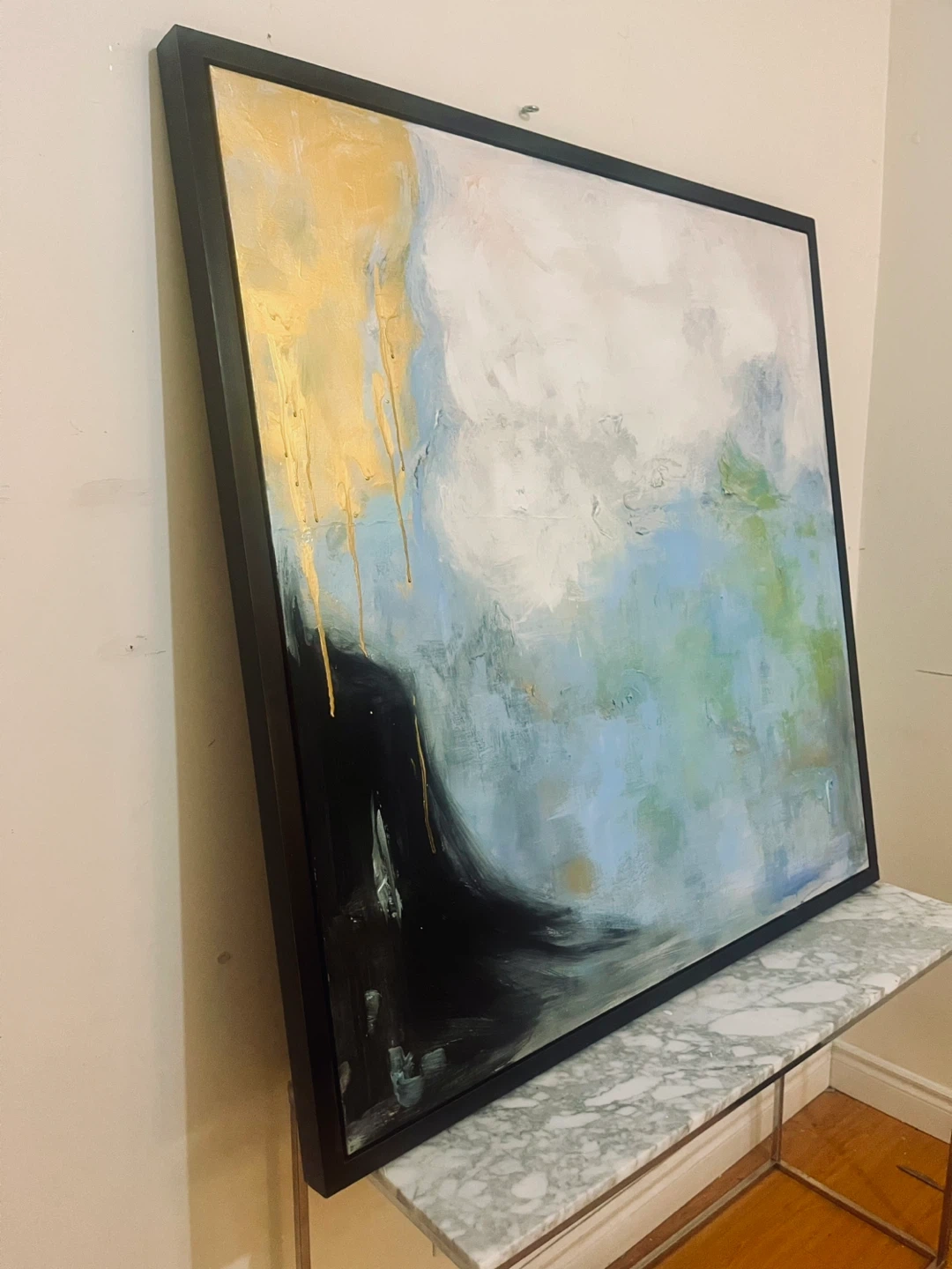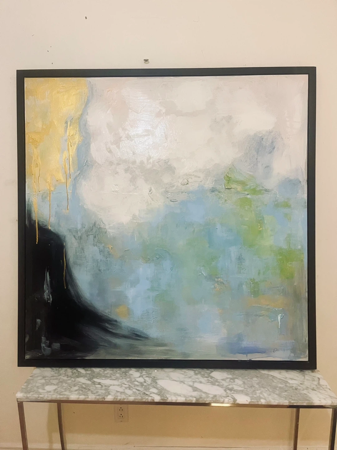 50” x 50” square. Selling a beautiful abstract painting with a sleek black frame. The artwork features a blend of blues, greens, whites, and striking gold accents. It's in great condition and ready to add a touch of modern elegance to your home!