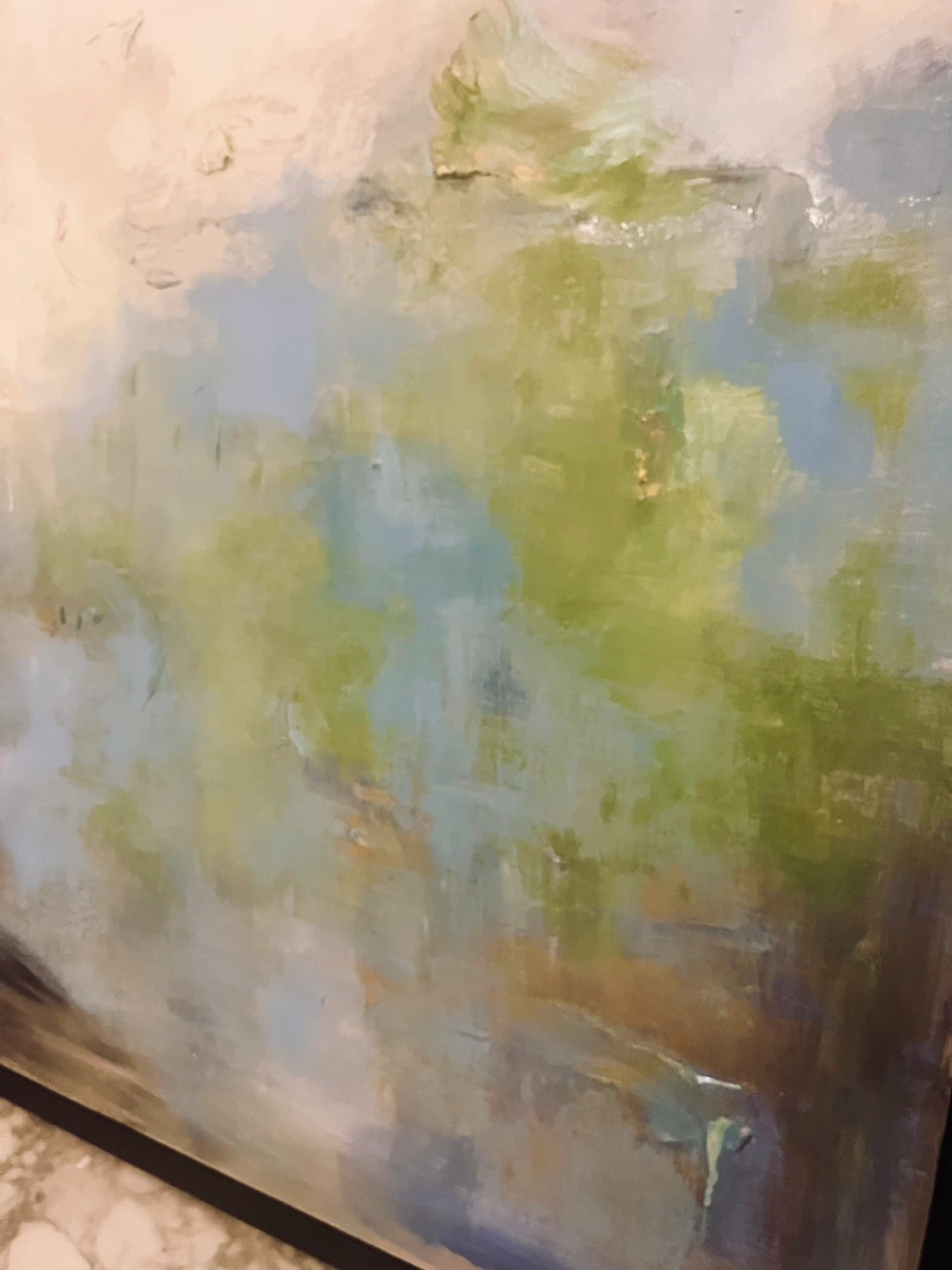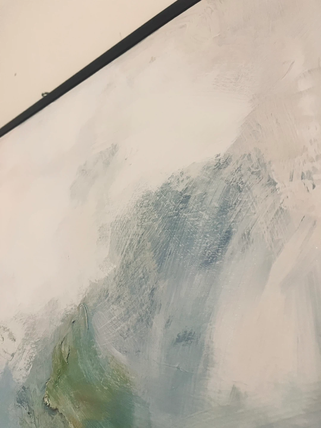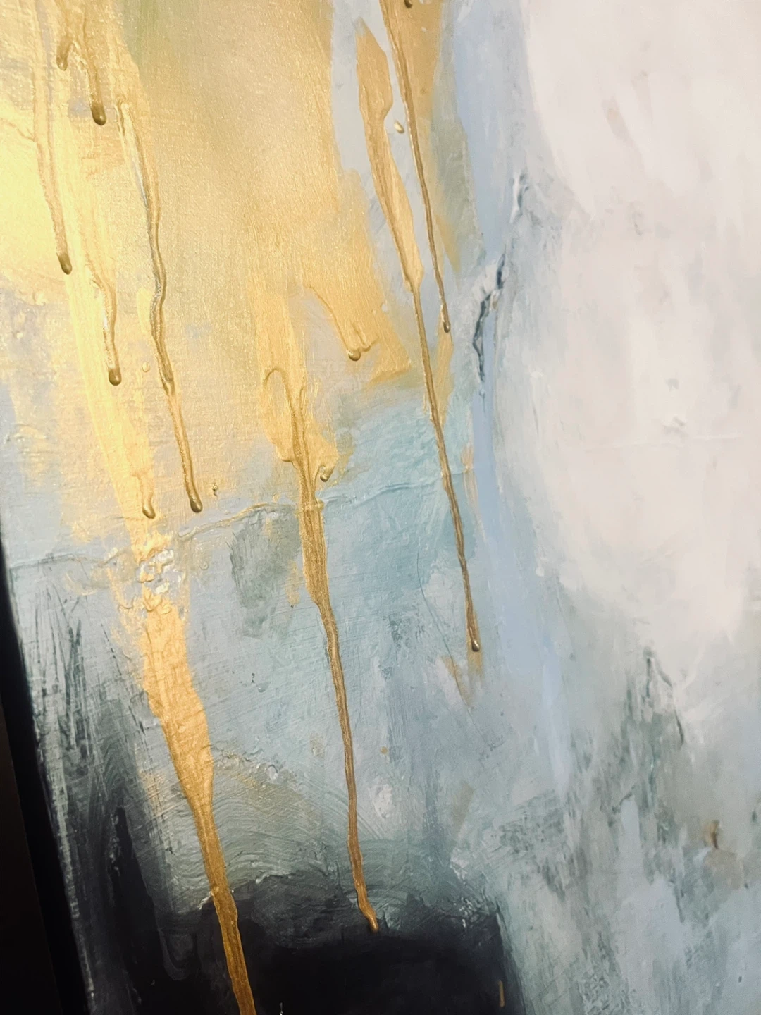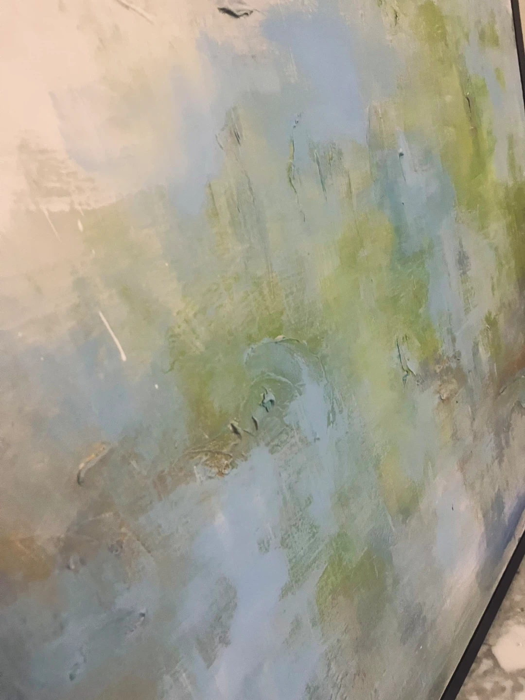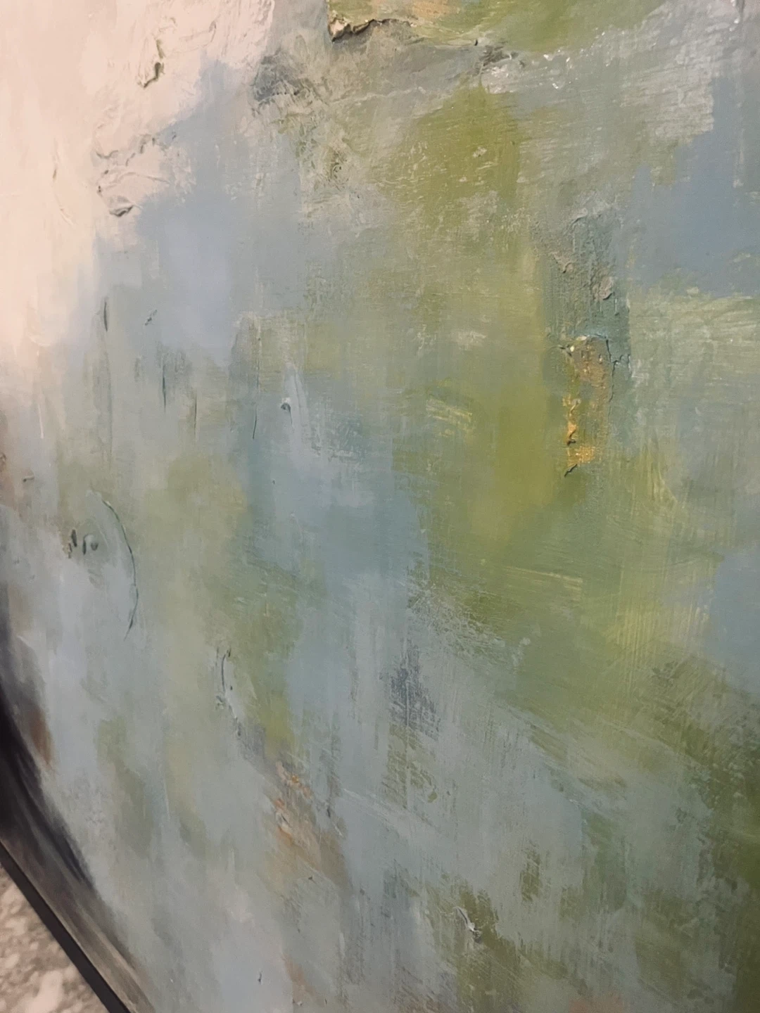 50” x 50” square. Selling a beautiful abstract painting with a sleek black frame. The artwork features a blend of blues, greens, whites, and striking gold accents. It's in great condition and ready to add a touch of modern elegance to your home!