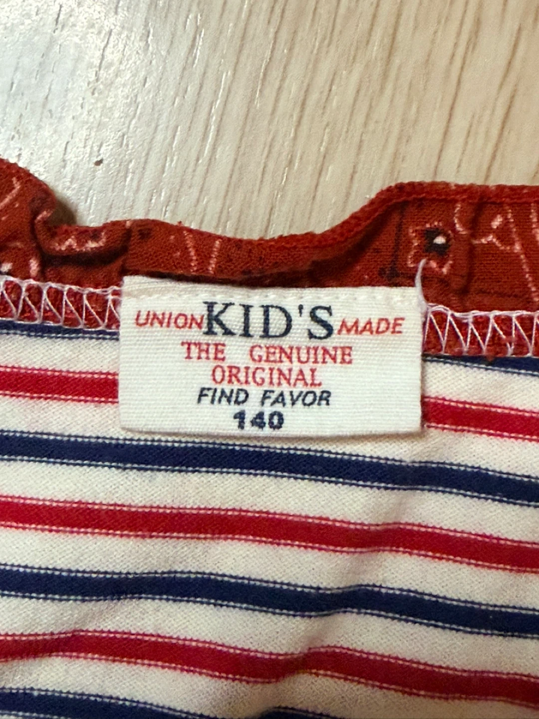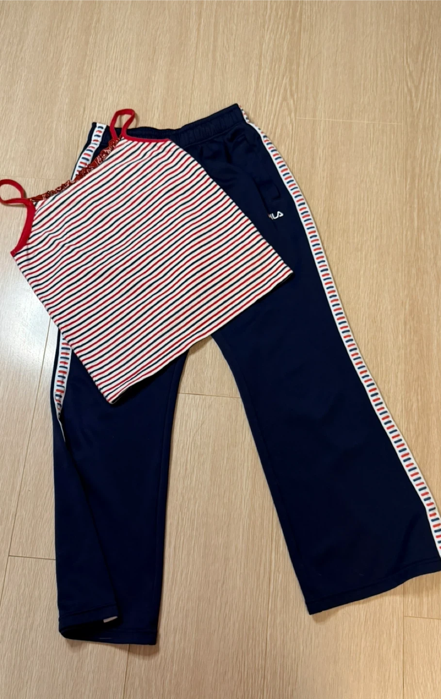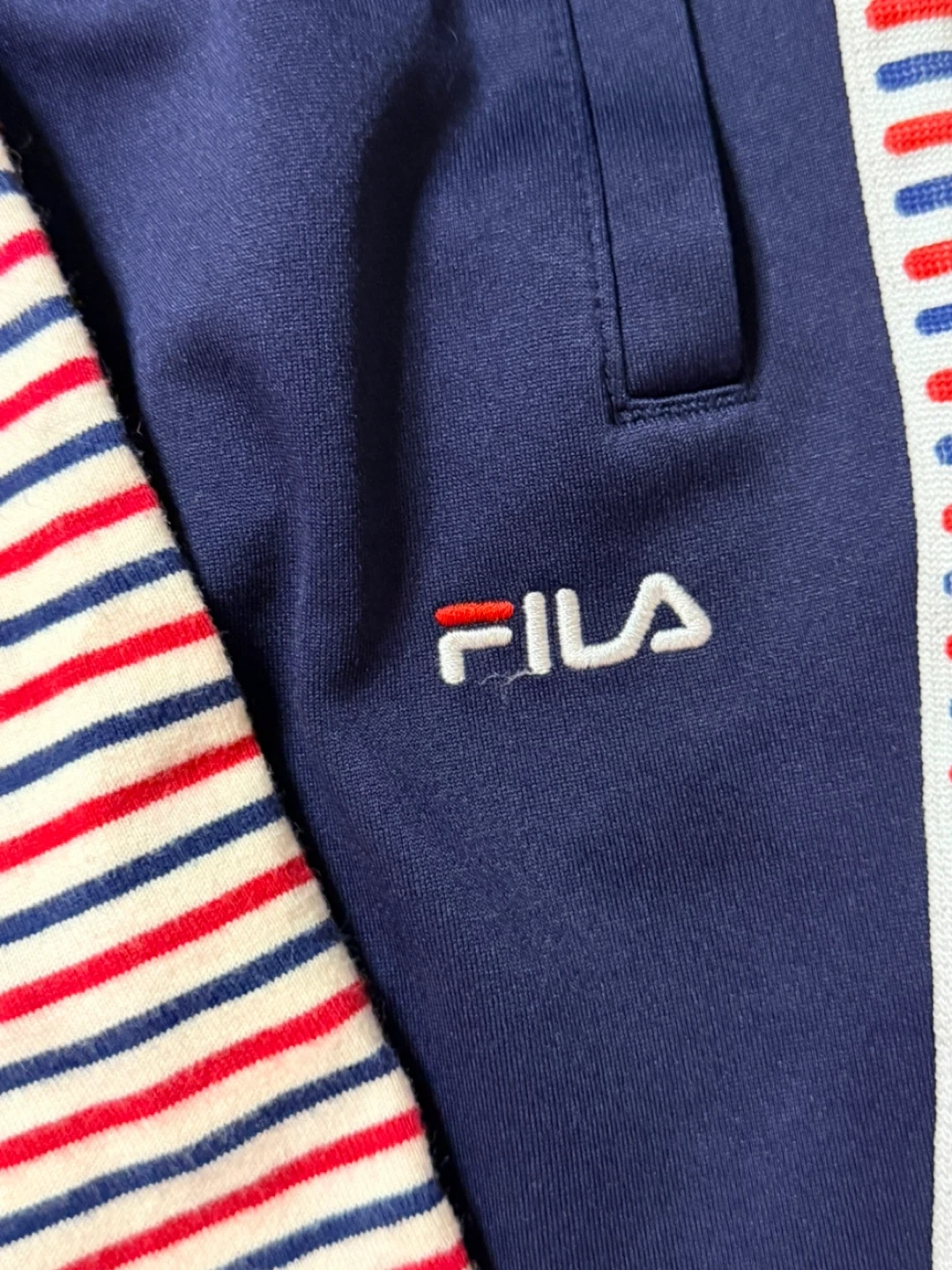 Selling a cute set that includes a Union Kid's tank top and a pair of Fila pants! The tank top has a red, white, and blue striped pattern. The pants are navy blue with white stripes down the sides. Both items are in good condition and size 140.