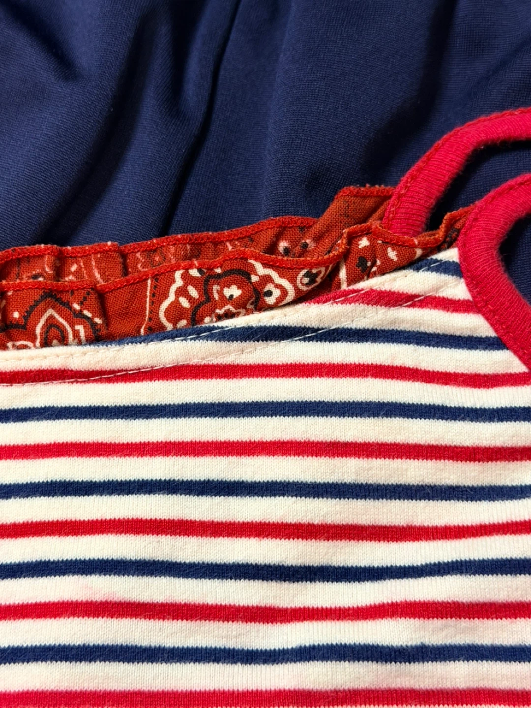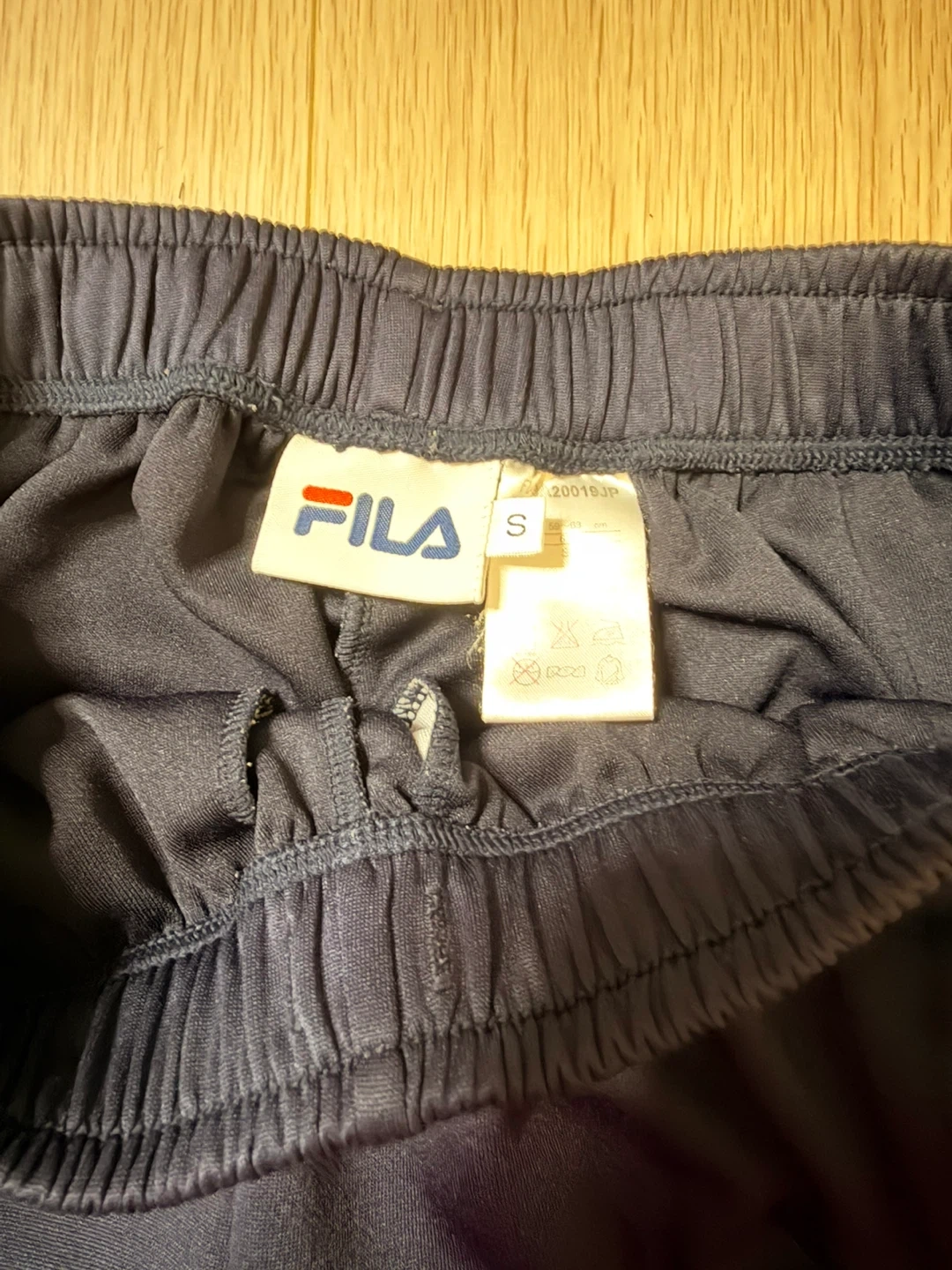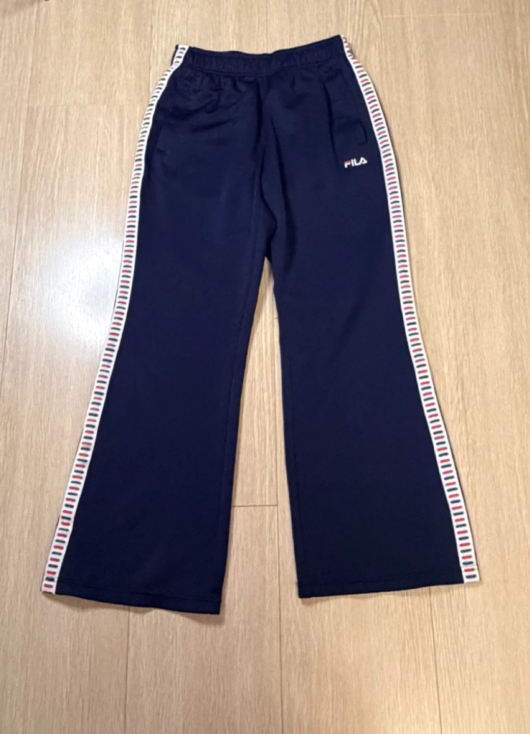 Selling a cute set that includes a Union Kid's tank top and a pair of Fila pants! The tank top has a red, white, and blue striped pattern. The pants are navy blue with white stripes down the sides. Both items are in good condition and size 140.