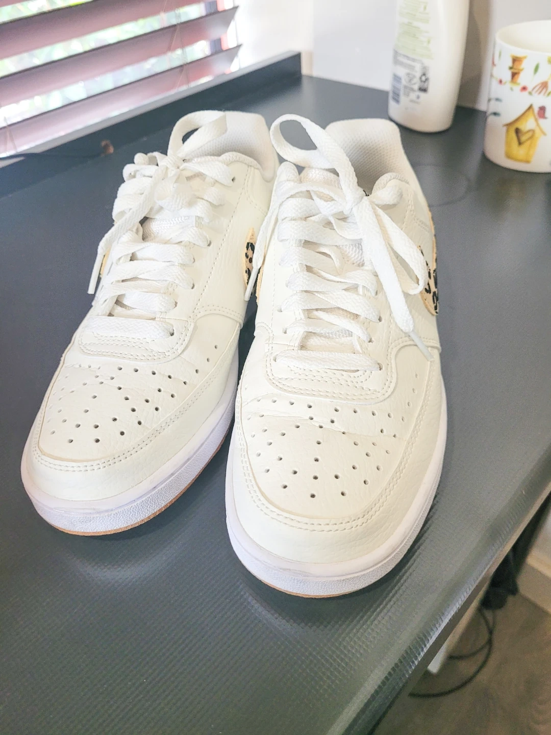 These Nike Court Vision Low shoes are in great condition! They feature a stylish white base with a fun leopard print swoosh. Perfect for adding a bit of flair to your everyday look
