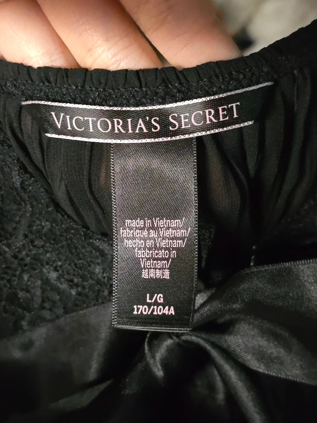 Selling a Victoria's Secret black lingerie piece in size L. It's in great condition and ready for a new home! The material is soft and flowy, perfect for lounging or a special occasion