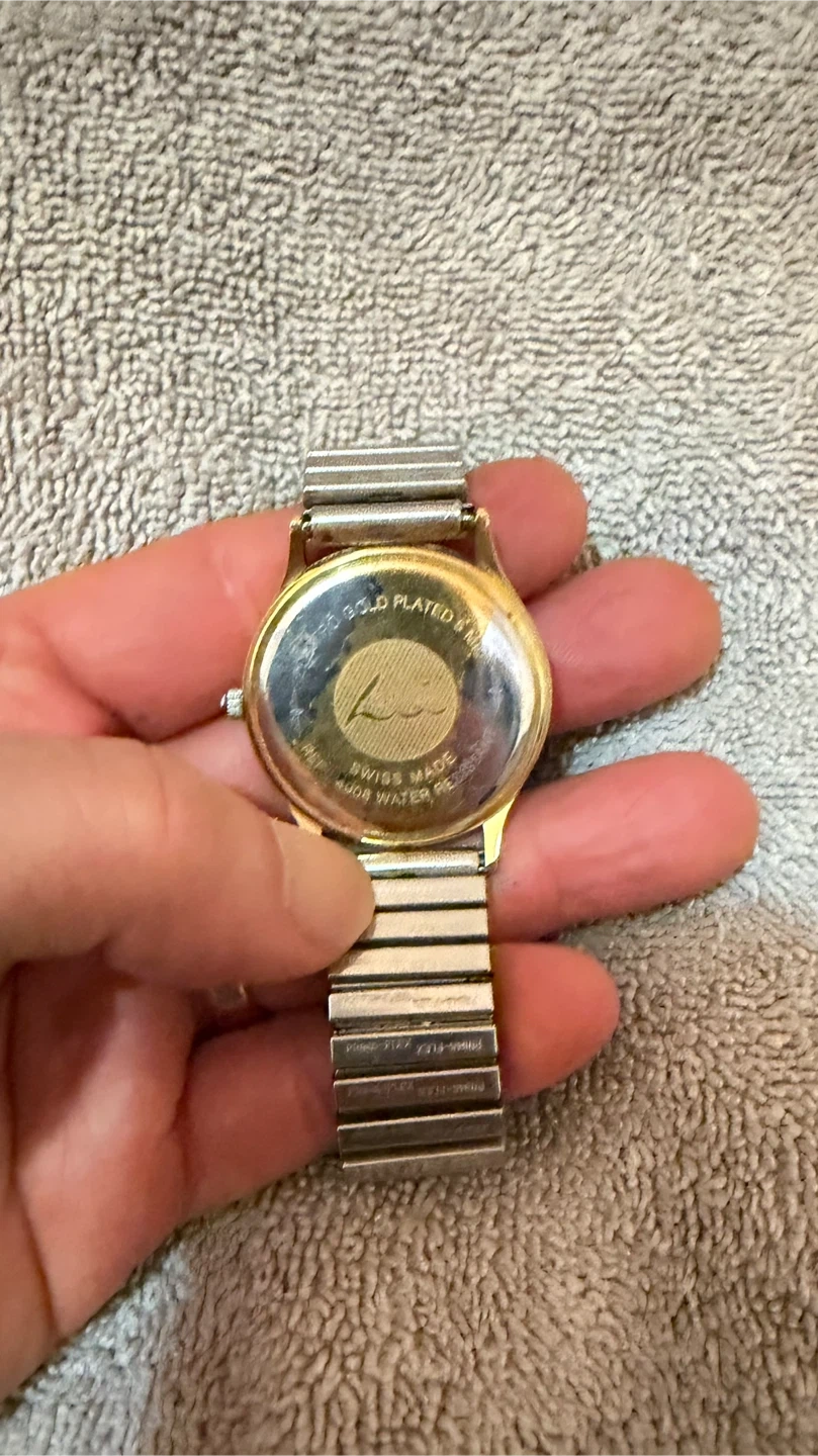 Selling a Rotary watch with a gold plated finish. It's Swiss made and water resistant to 100ft. The band is silver in colour. It needs a new battery.