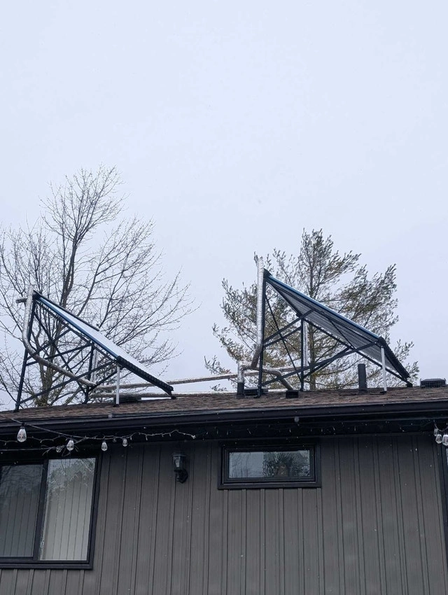 Solar hot water heater with some spare tubes, roof brackets and tubes only. No pumps. Must come and disassemble it. It's a solar vacuum tube collector, a type of solar panel used for heating water. It transfers heat from the sun to a copper heat pipe inside a vacuum tube. The vacuum insulation minimizes heat loss, making it efficient even in cold weather. It can be used for space heating or solar heating, especially in regions with cold winters. The cylindrical shape allows for effective performance even when sunlight is low or shaded. It is made of strong borosilicate or soda lime glass, resistant to high temperatures. With no moving parts, it has a long lifespan of 20+ years. It is more efficient than PV panels, requiring less roof space. It is suitable for hydronic systems. Call or text 705-440-9159