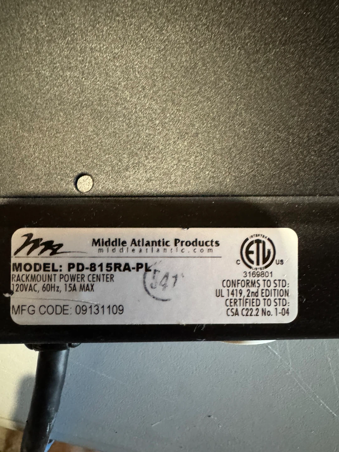Selling a Middle Atlantic Products rackmount power center. It operates at 120VAC, 60Hz, with a maximum of 15A.