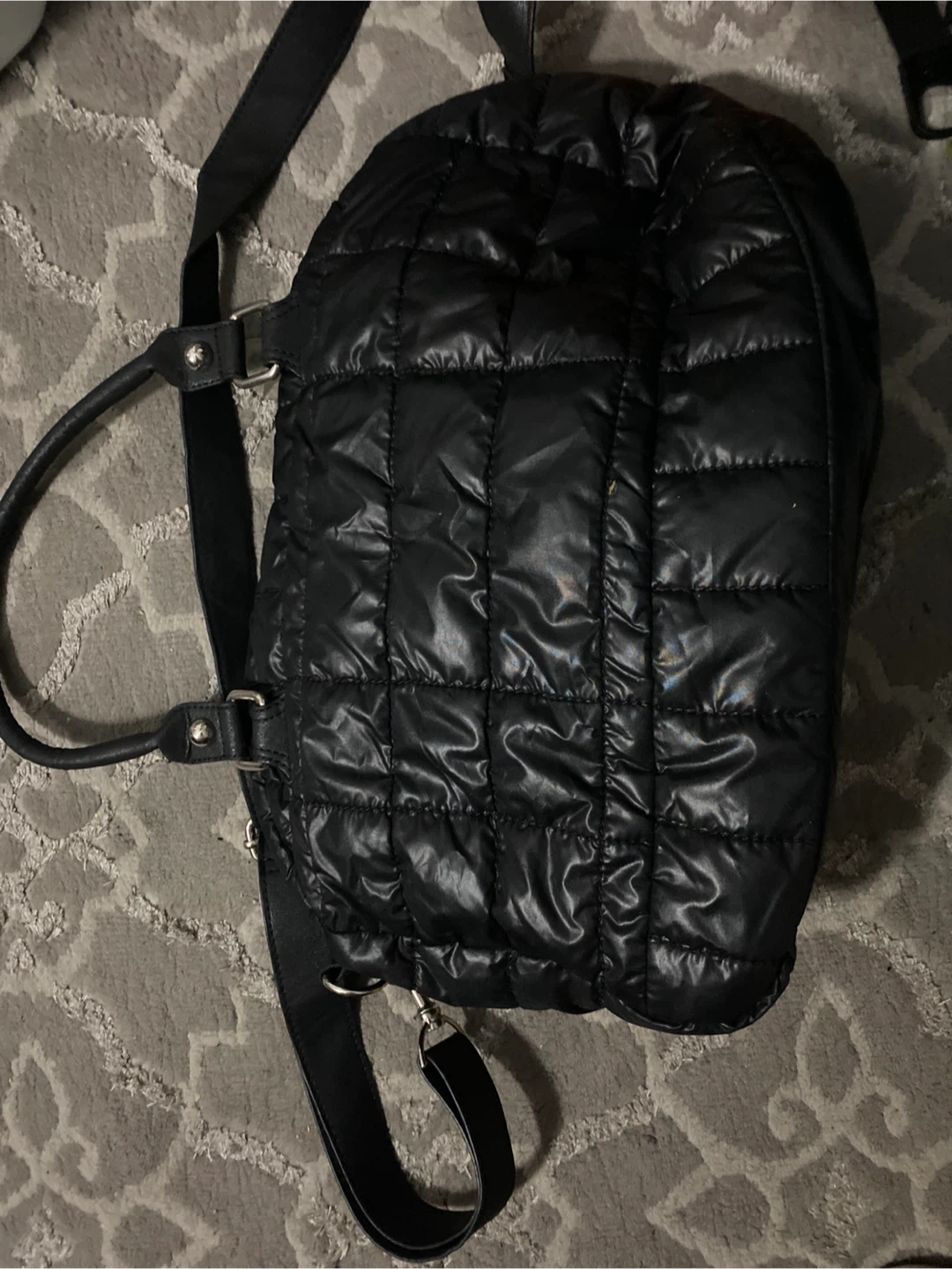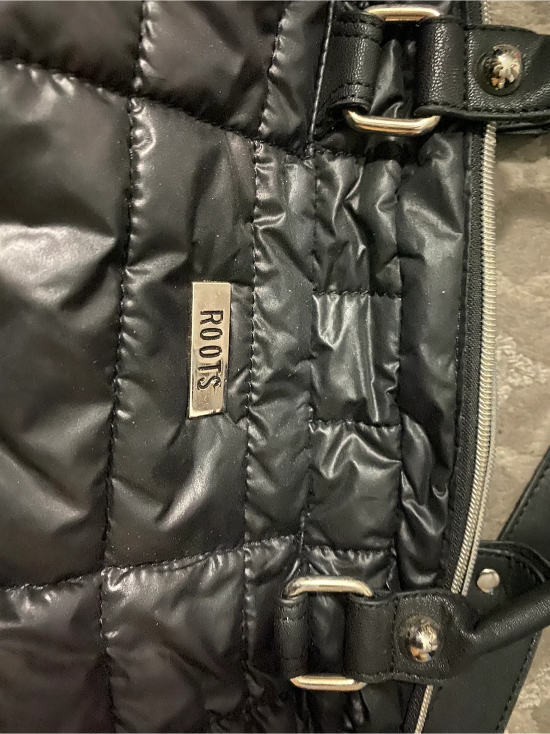 Roots black puffer tote bag with leather adjustable/removable shoulder/bodycrossstrap and double hand handle it’s soft and lightweight very chic style