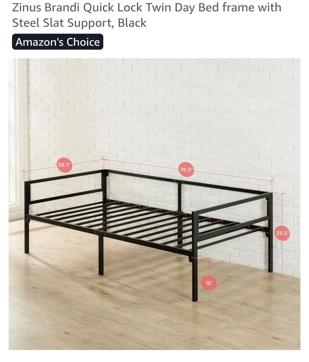 Selling a Zinus Brandi Quick Lock Twin Day Bed frame with steel slat support in black. This frame is sturdy and easy to assemble! The dimensions are approximately 39.7" x 76.5".