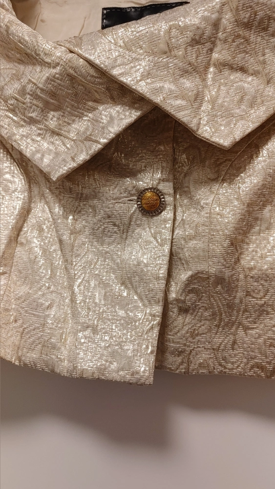 Selling a gold cropped jacket from Wet Seal Collection. It's made of 45% acetate, 41% cotton, and 14% metallic.