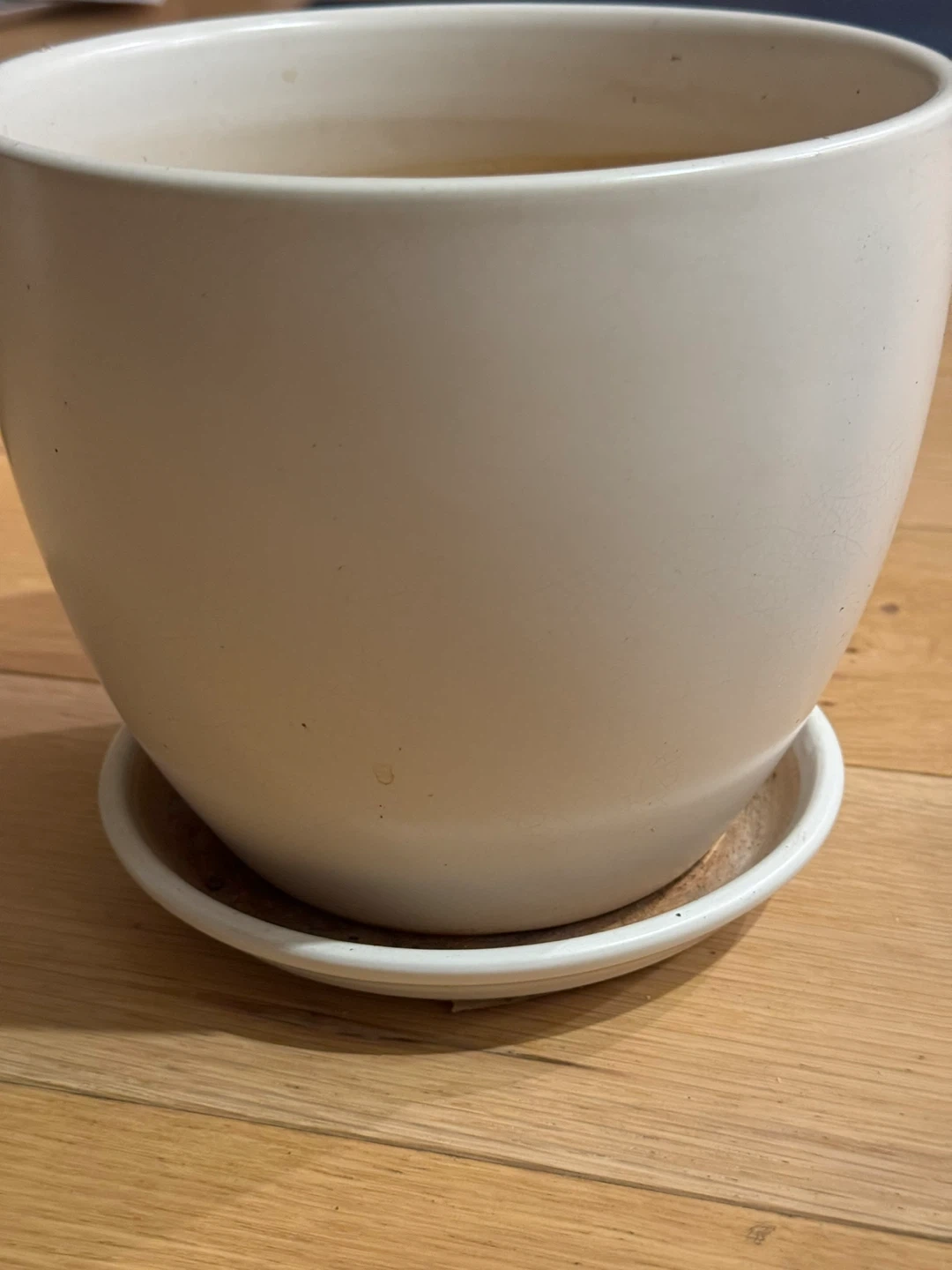 - 1 White/Cream 7x7inch round ceramic planter pot with tray and drainage hole from Natty Garden BK (value in store: $26)