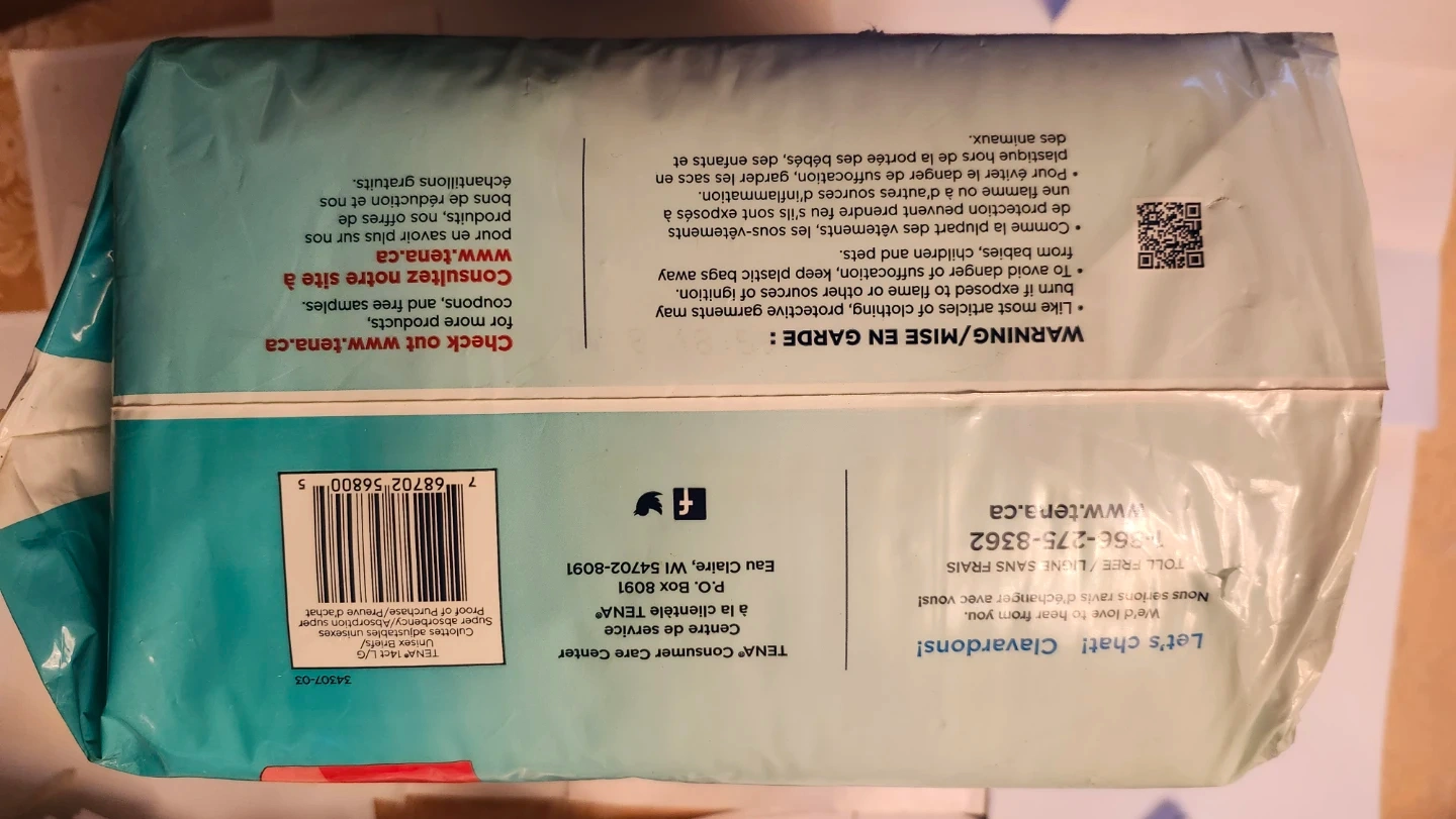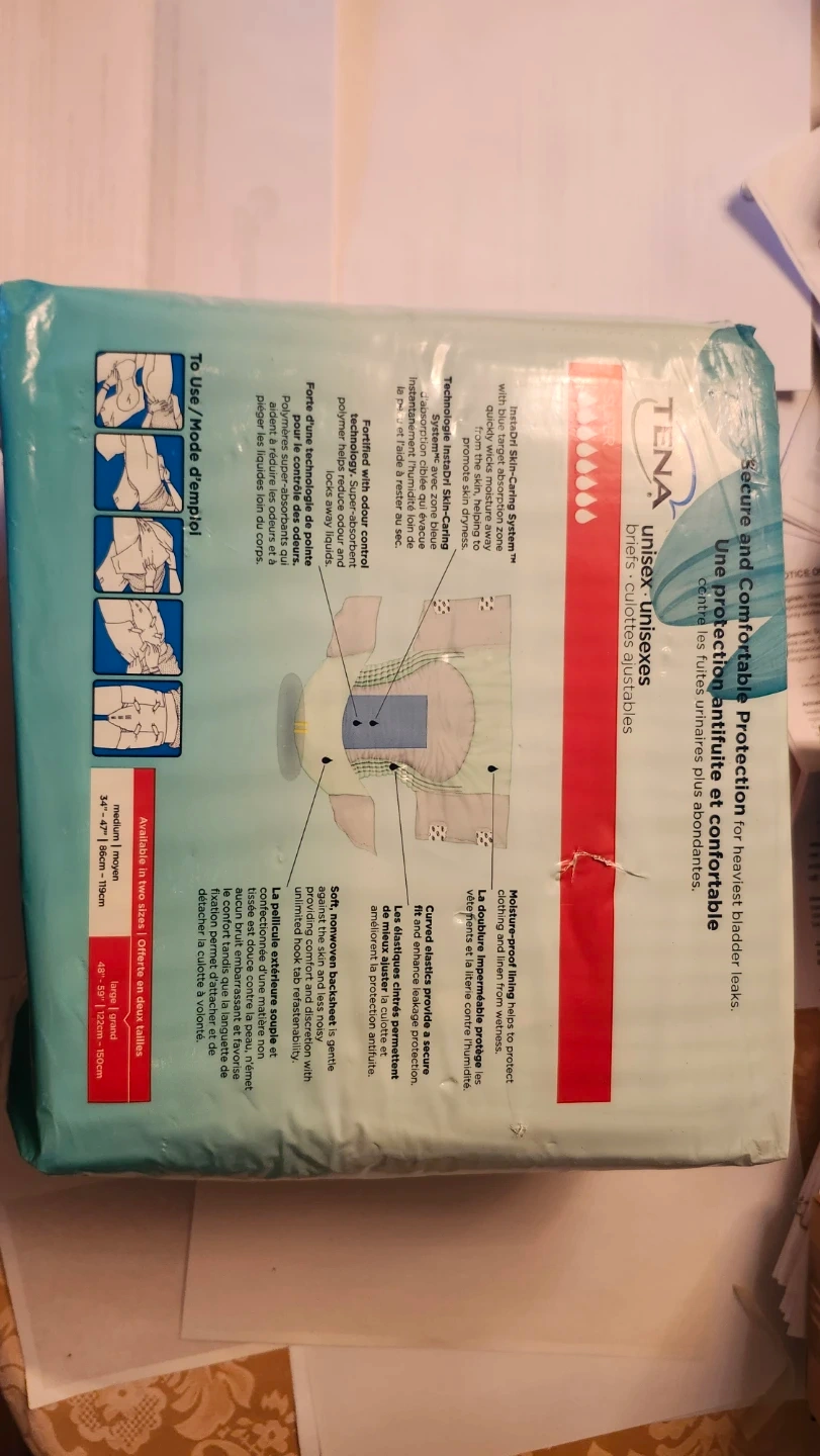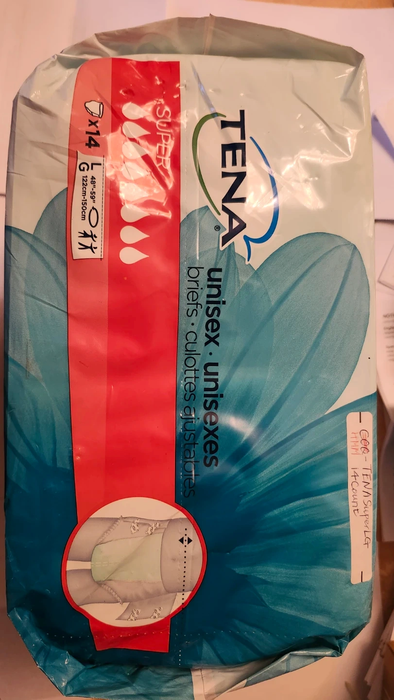 Selling a pack of TENA unisex super briefs. They are size large and there are 14 in the pack. Available in two sizes: Large / Grand 40 - 59 in / 102cm - 150cm