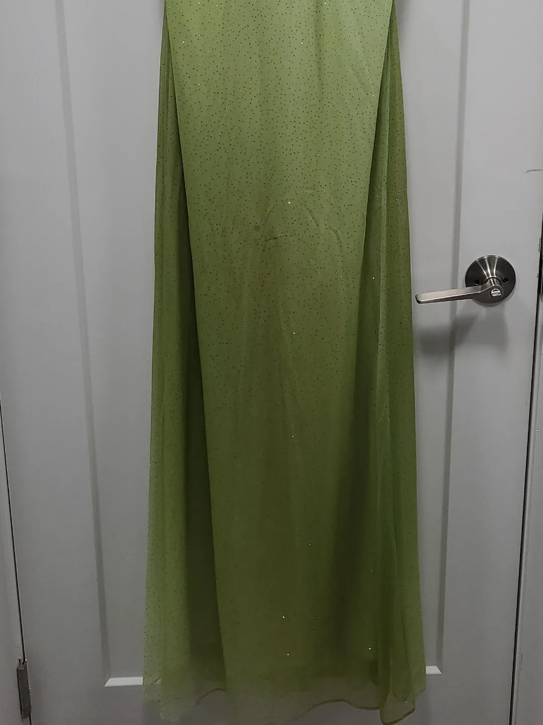 This is a lovely green dress! It has a sheer fabric with small, sparkly details throughout. It's in great condition and ready for a new owner!
