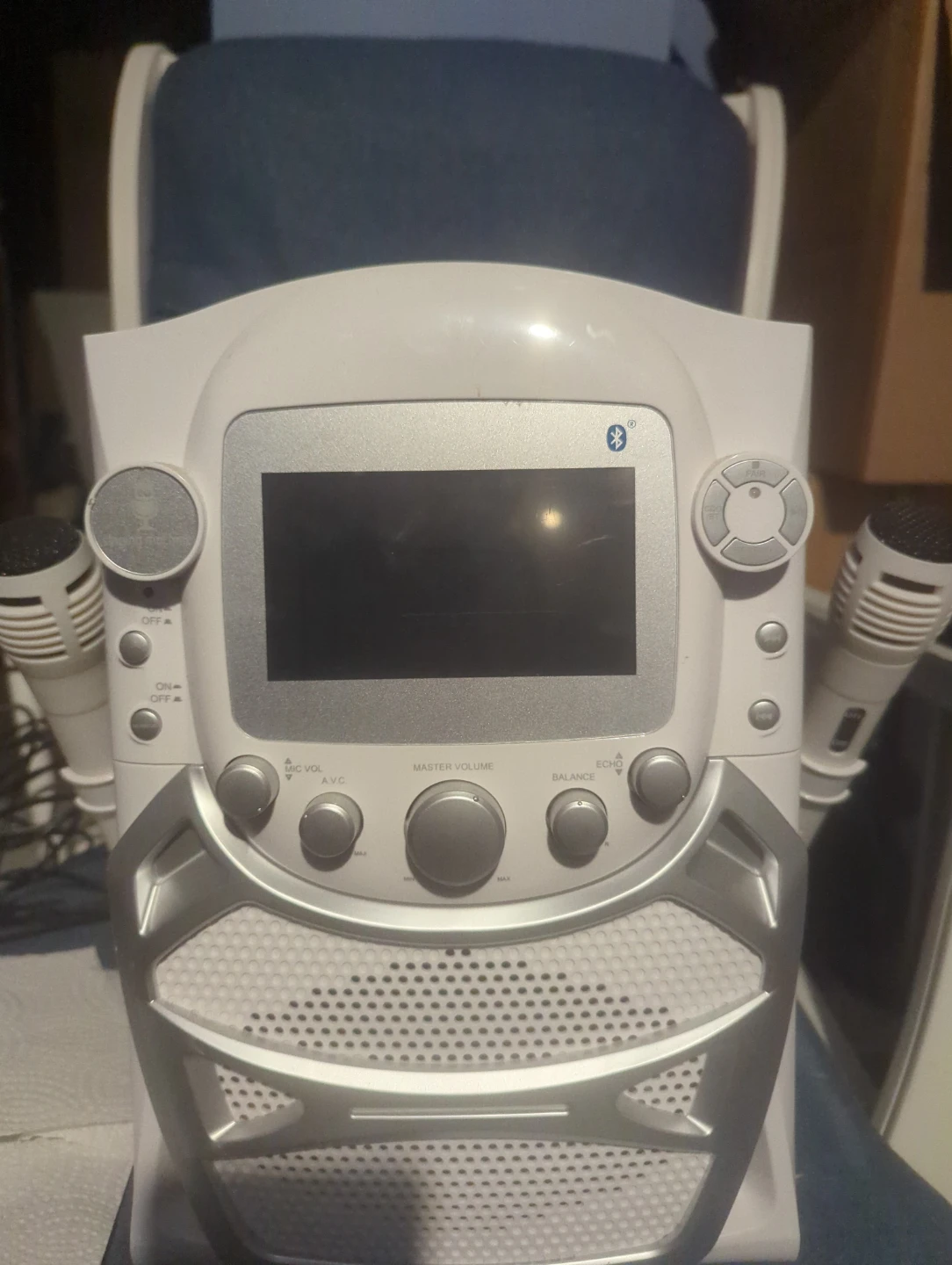 Selling a karaoke machine that comes with Bluetooth connectivity! It features volume and balance controls, and two microphone inputs. Perfect for some family fun!