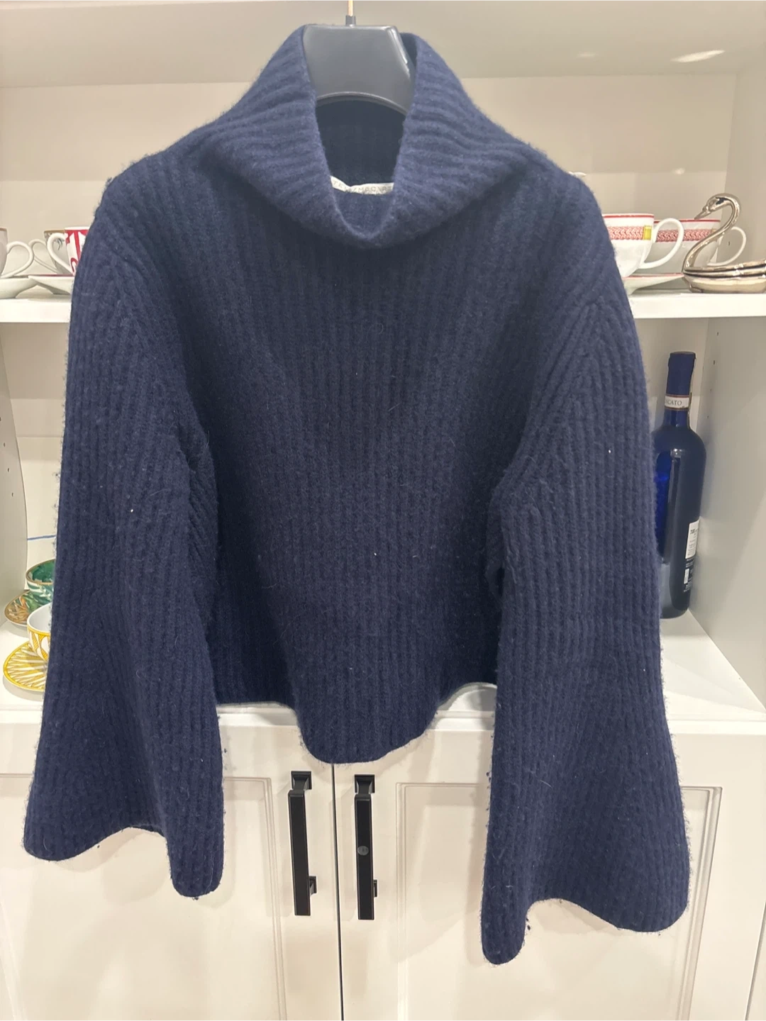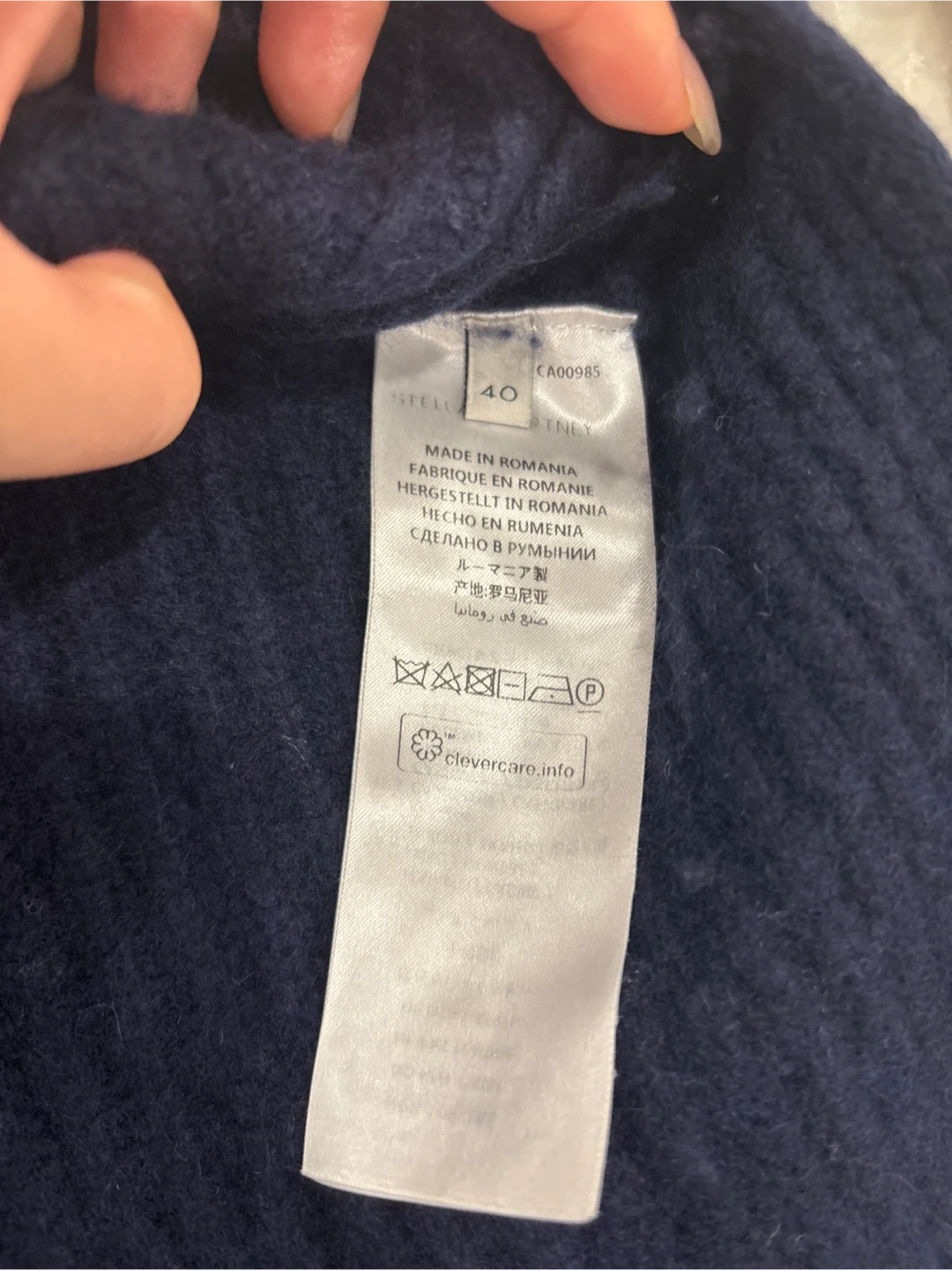 Selling a stylish Stella McCartney cashmere sweater in a beautiful navy blue colour! It's a size 40 and. The sweater has a lovely, relaxed fit with bell sleeves and opens on the sides. Perfect for staying cozy and chic!