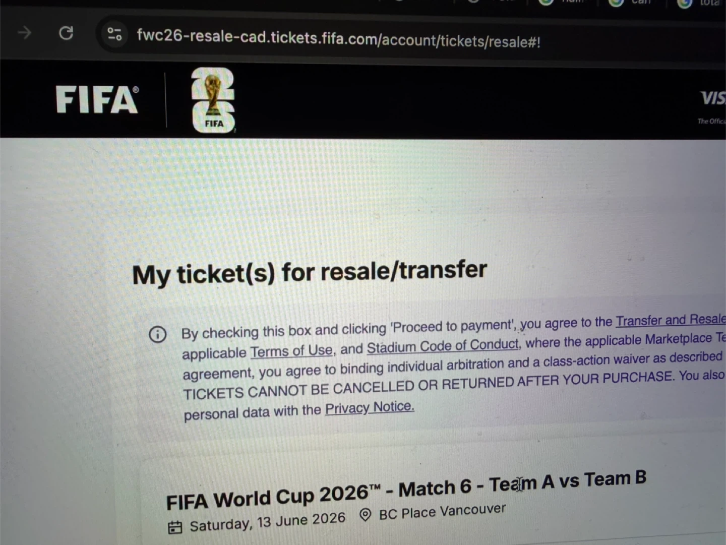 Selling two tickets to the FIFA World Cup 2026, Match 6 - Team A vs Team B, in Vancouver at BC Place on Saturday, June 13, 2026