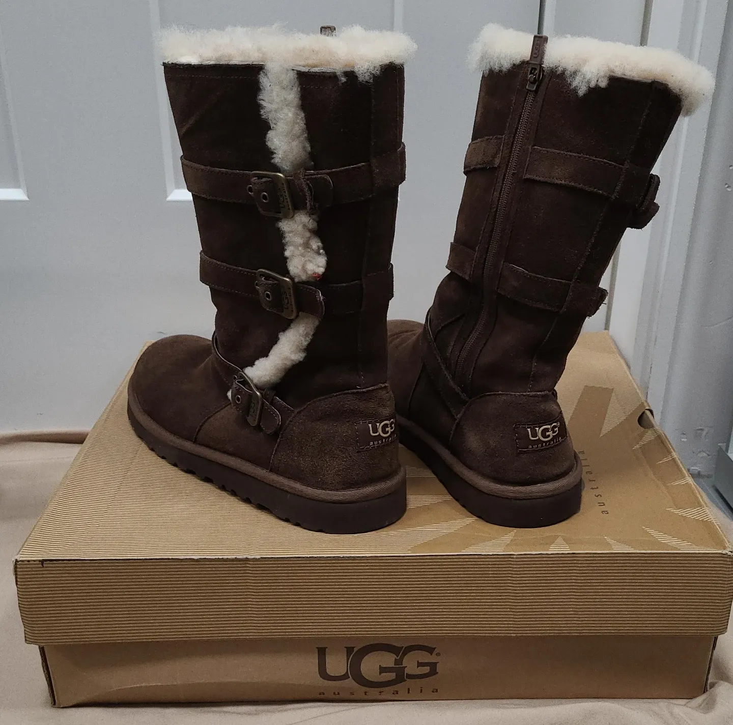 UGG Australia boots in a lovely brown suede. These boots feature a stylish design with buckle straps and a cozy sheepskin lining. Perfect for keeping your feet warm and fashionable during the colder months!