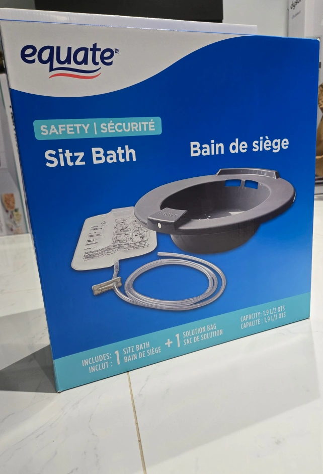 I'm selling an Equate Sitz Bath, designed to fit standard toilets. It features an ON/OFF flow control clip for your convenience. It can be used after an episiotomy or for postpartum recovery, and is also useful for the treatment of hemorrhoids and other conditions of the anal and genital areas. It includes one sitz bath and one solution bag, with a capacity of 1.9 L / 2 QTS
