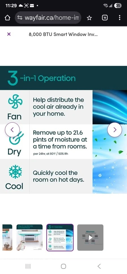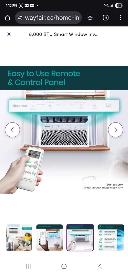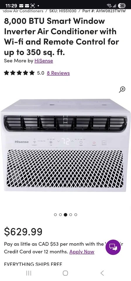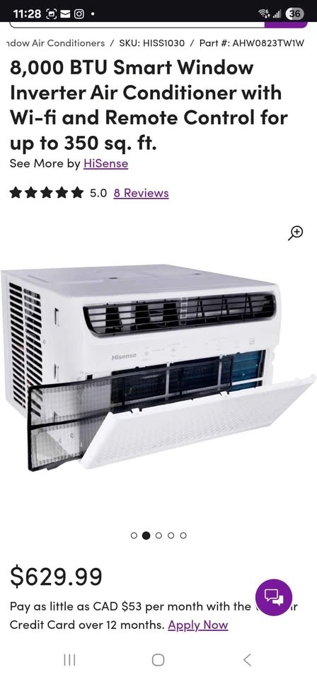 This is a new Hisense 8000 BTU smart window inverter air conditioner with Wi-Fi and remote control, suitable for spaces up to 350 sq. ft. Never been opened or used! Here are some of its specs: