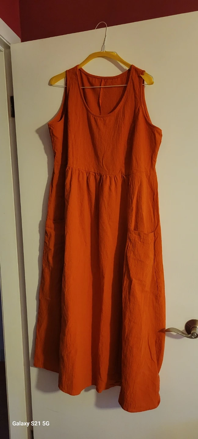 Here's a lovely orange sleeveless dress! It looks like it would be perfect for summer days. It's in great condition and ready for a new home!