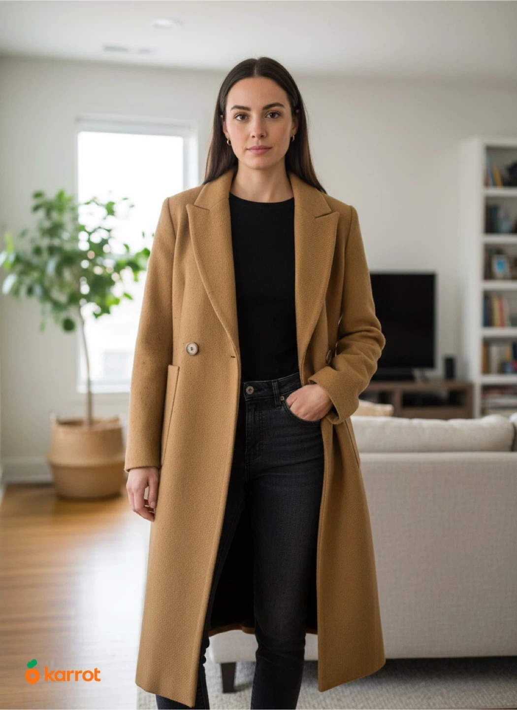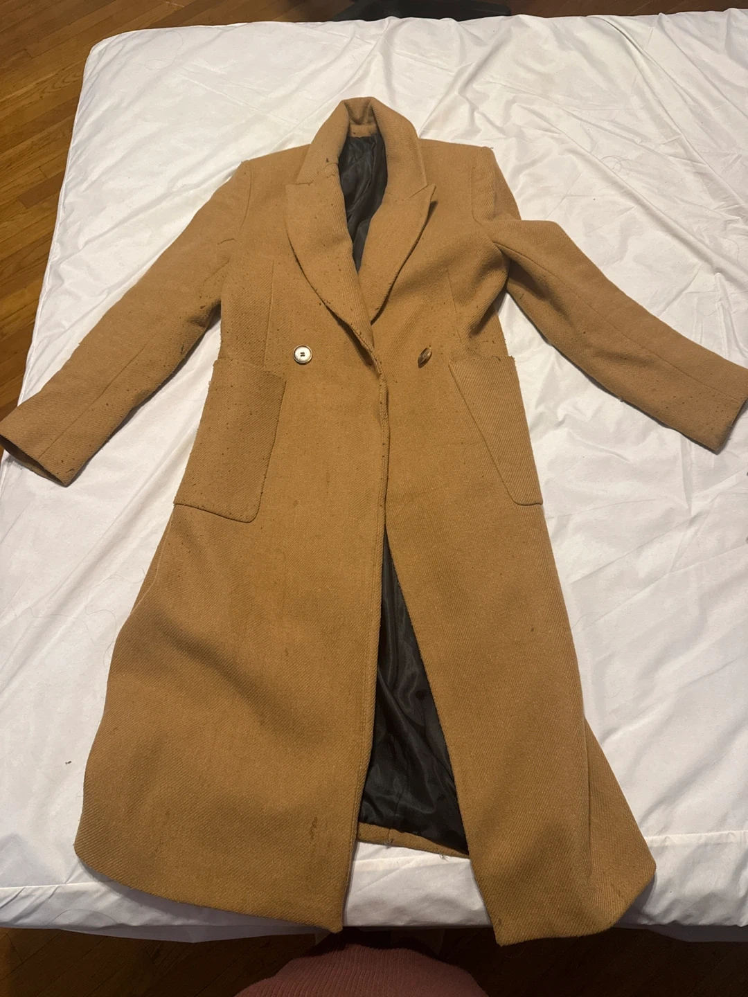 Selling a tan overcoat. It's a stylish piece that's perfect for layering during the cooler months. It features a double-breasted design and a classic cut. Please note that there are some signs of wear, as shown in the photos.