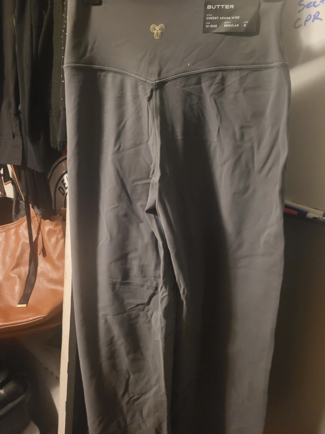 Selling a pair of TNA Asana Hi Wide leggings in a lovely charcoal grey colour! They're a size 6 and feature a high-rise waist. These leggings are designed for low impact activities, with a buttery soft second skin feel and sweat-wicking properties. Originally bought for $98