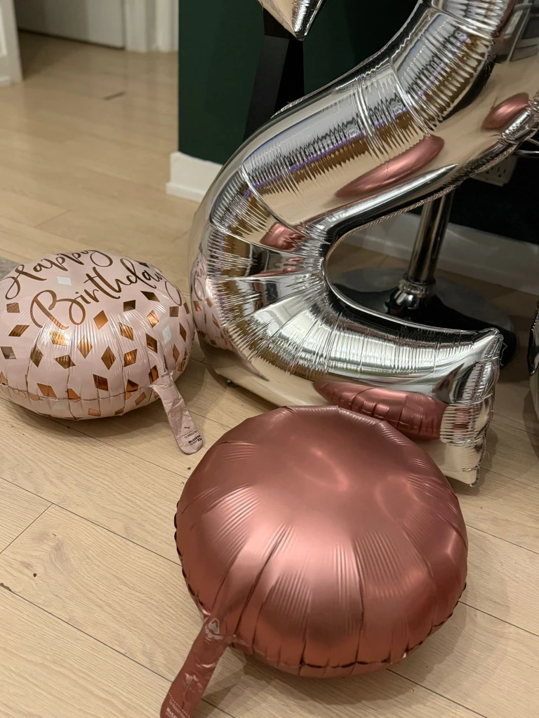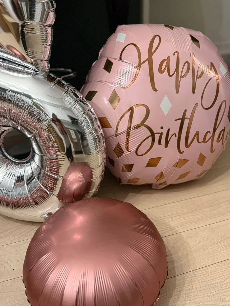 Includes 2 large silver number balloons and 4 “Happy Birthday” balloons in elegant pink & gold design.