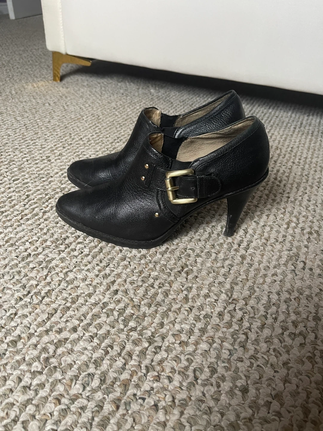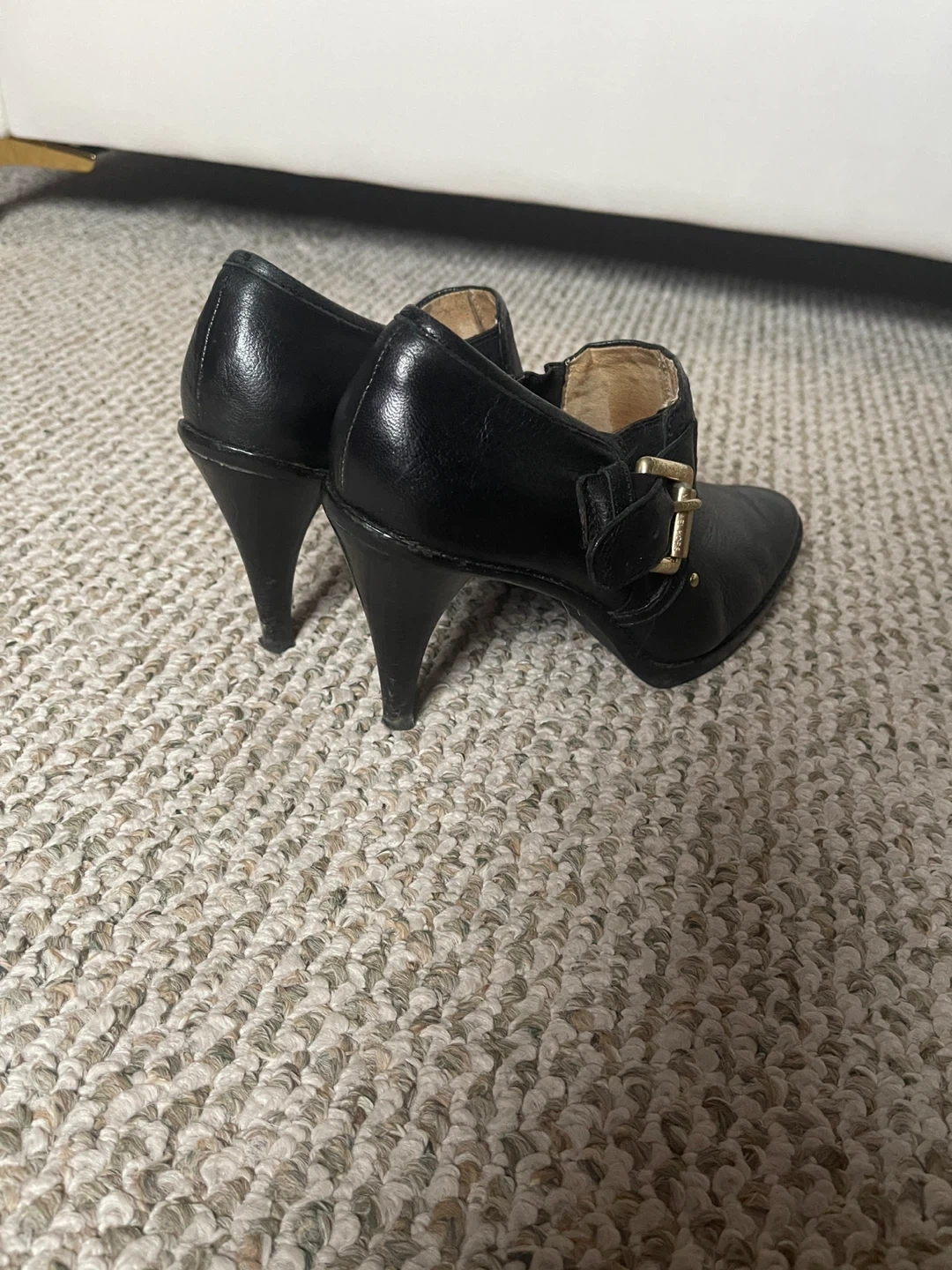These are a pair of MICHAEL Michael Kors black leather heeled booties. They feature a stylish buckle detail and are in good used condition. Perfect for adding a touch of elegance to your outfit!