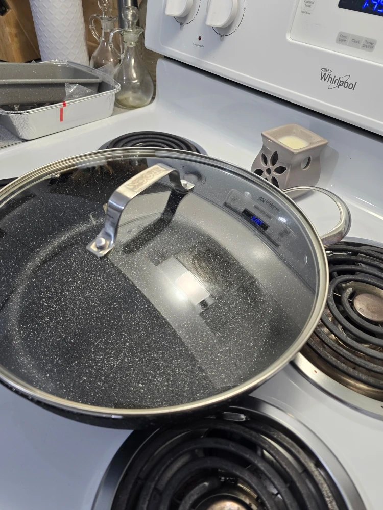 Selling a frying pan with a lid. It's in great condition and ready for a new kitchen! The pan has a speckled finish and metal handles.
