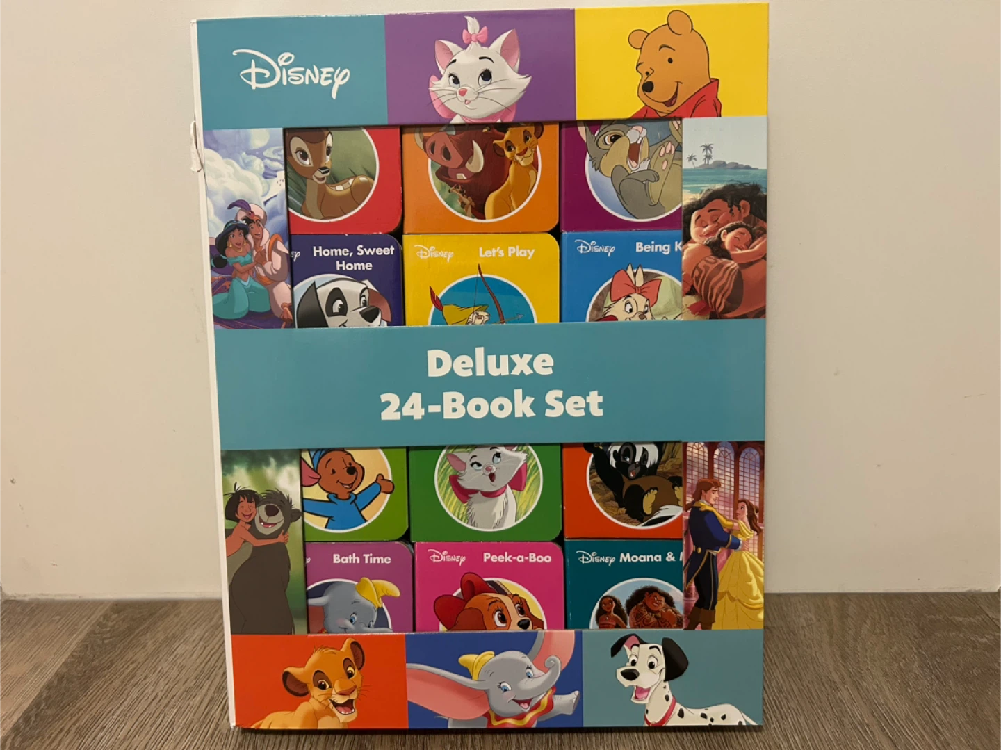 a Disney Deluxe 24 mini board Book Set! It's a collection of small, colourful board books featuring classic Disney characters and stories. Perfect for little ones who love Disney!