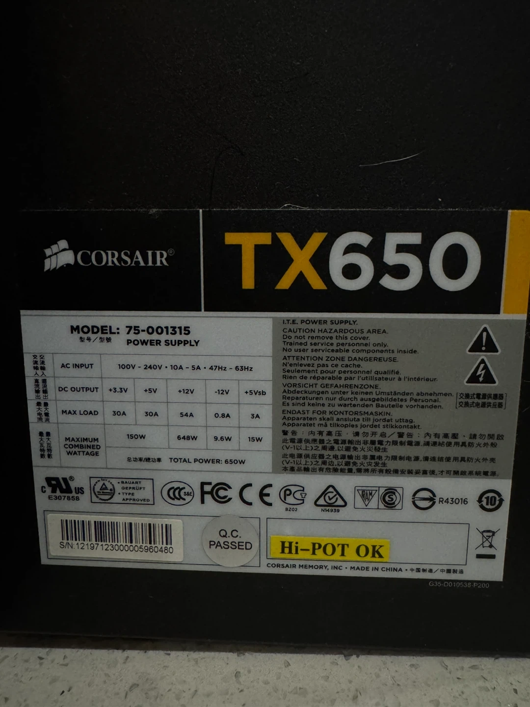 Selling a Corsair TX650 power supply. It's a reliable power supply for your computer build. The model number is 75-001315. It supports 100V-240V input. It has been tested and is in good working condition.