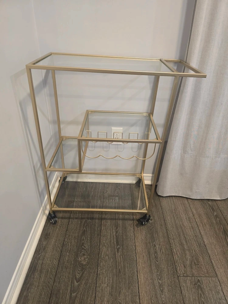 Selling a stylish gold bar cart with glass shelves! It has a modern design and is perfect for storing your favourite drinks and glassware. The cart also features wheels for easy mobility, making it a great addition to any home or entertaining space