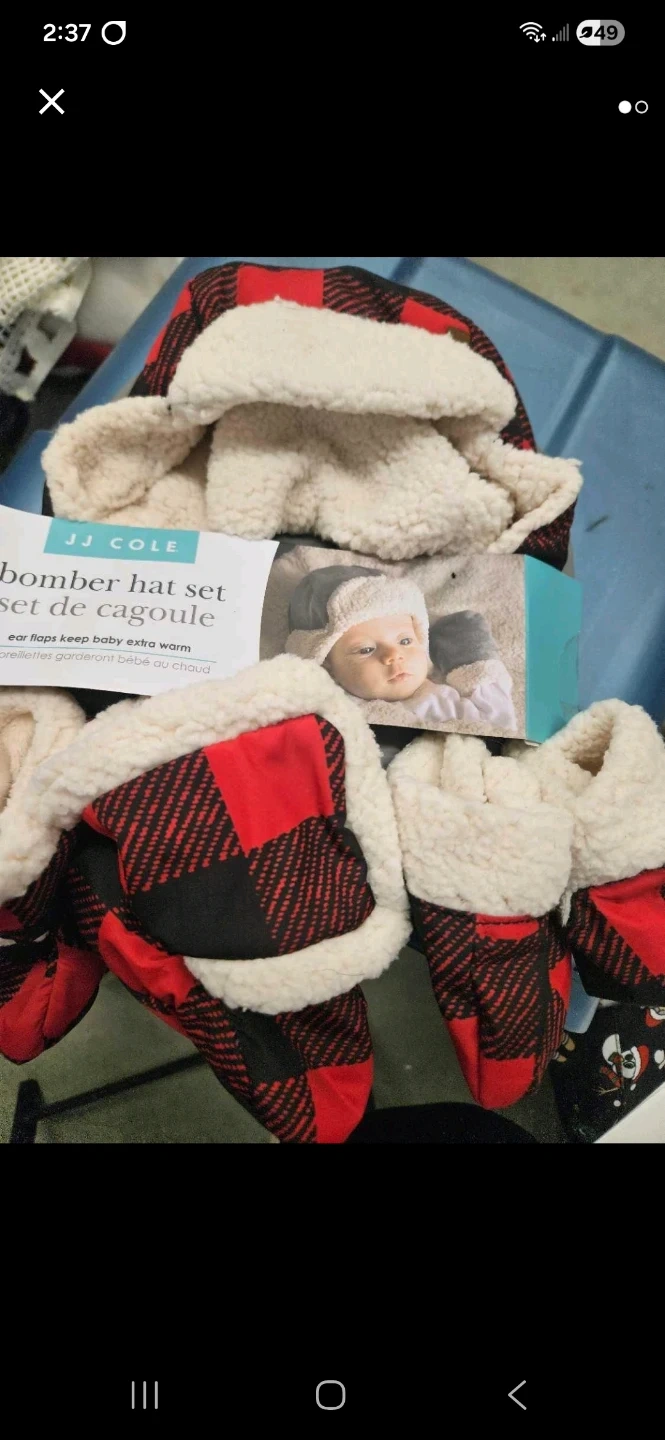 JJ Cole bomber hat set for baby! This set includes a hat and mittens with ear flaps to keep baby extra warm. The set is red and black buffalo plaid with a cream-coloured sherpa lining.