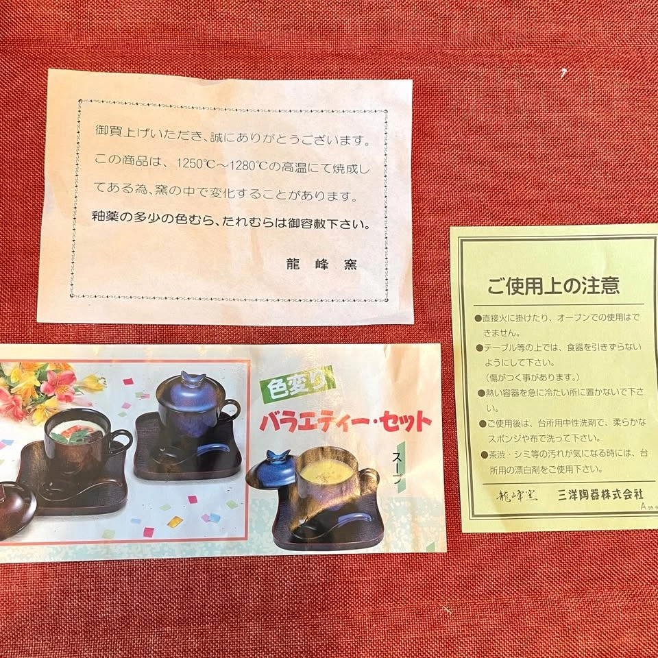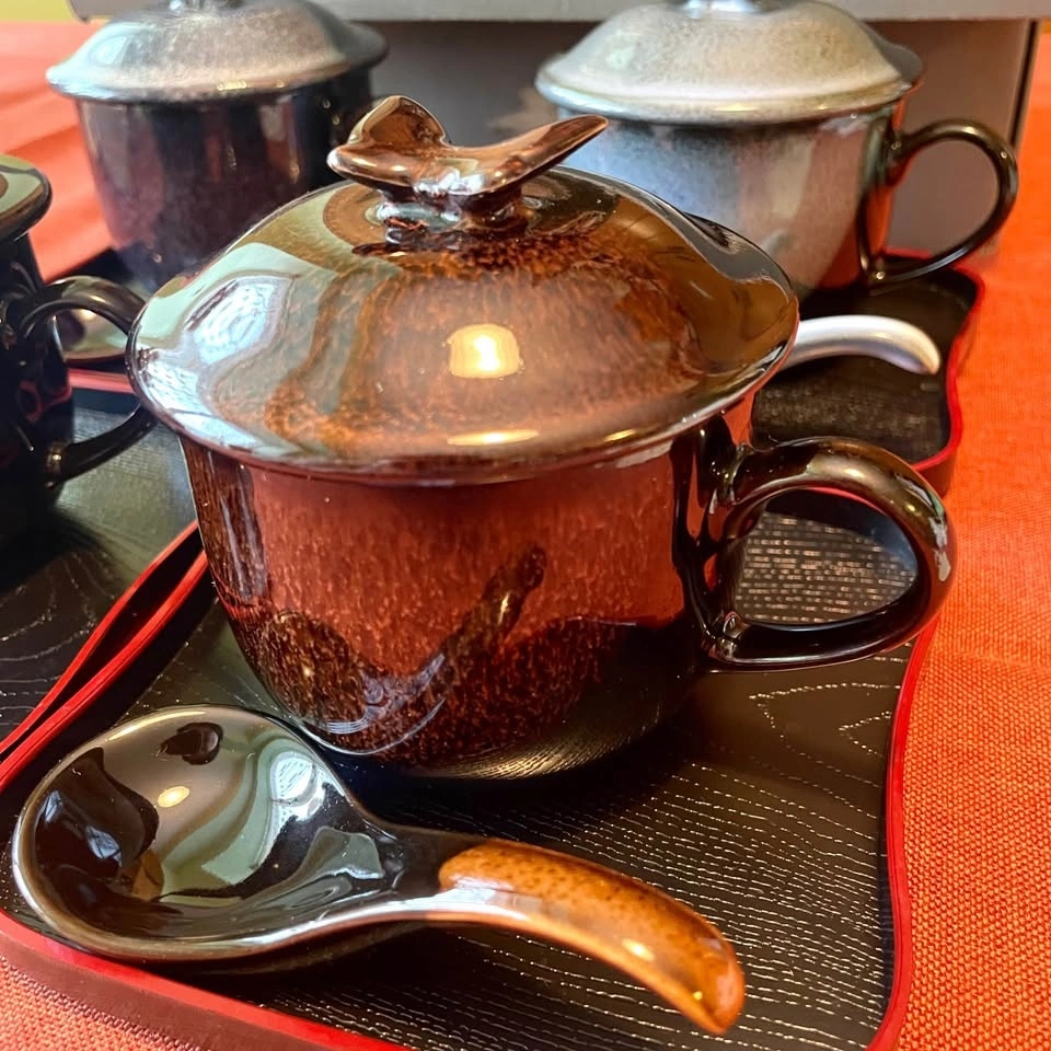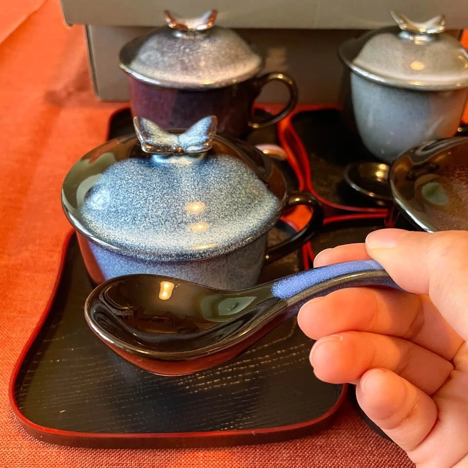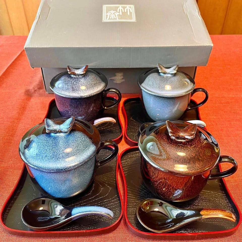 Butterfly Lidded Soup Cups Set of 4 w Spoons & Trays