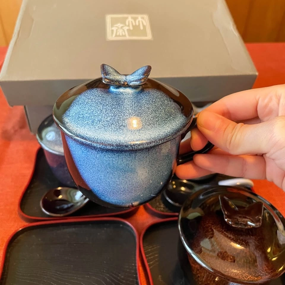 Beautiful set of Japanese lidded soup cups crafted in the renowned Arita porcelain tradition. Each cup features a charming butterfly shaped knob on the lid.