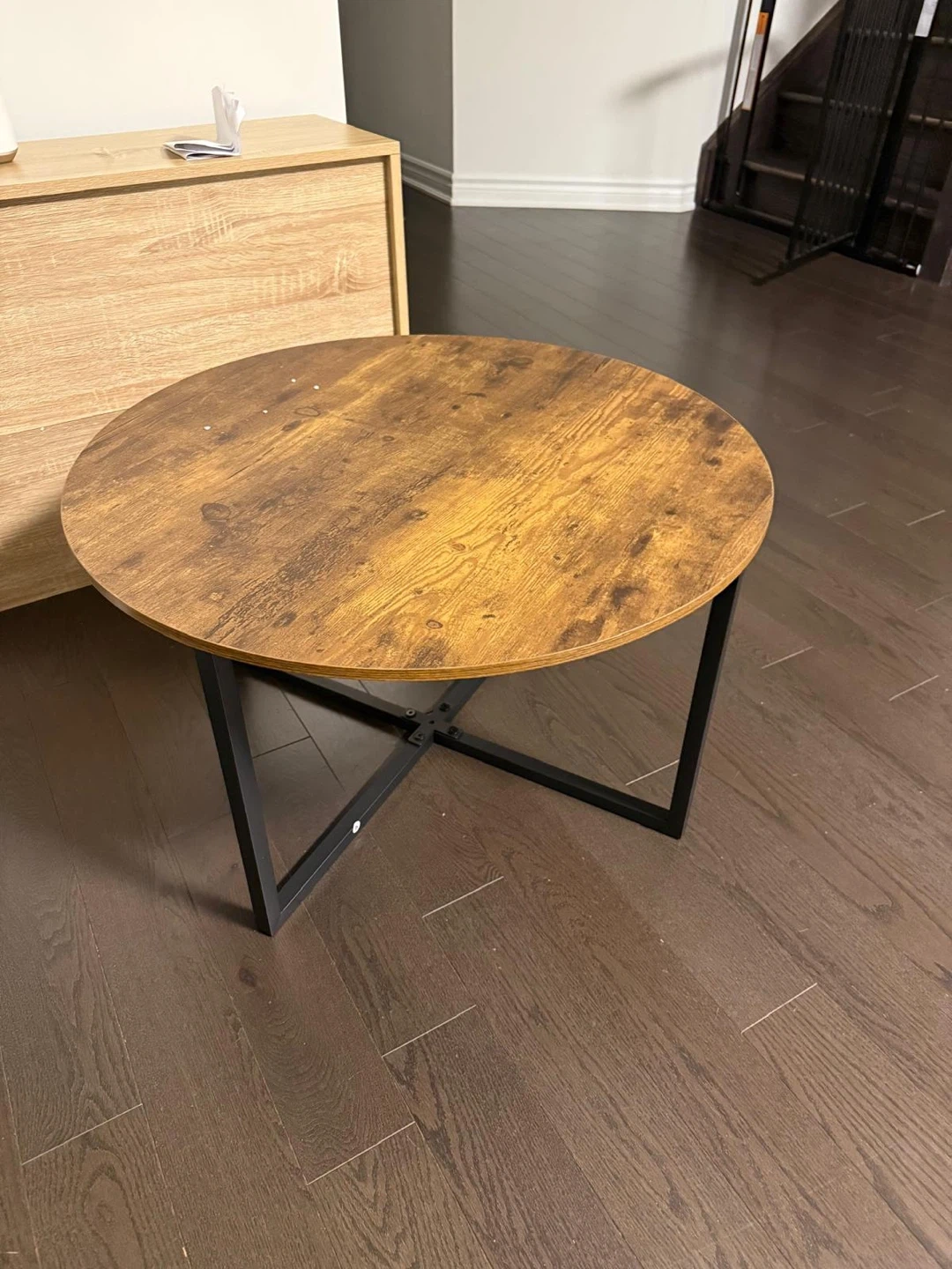 Selling a round coffee table with a brown wooden top and black metal legs. It's in great condition and would look great in any living room or den! The table has a unique design with a cross-shaped base, adding a touch of modern flair to your space. Perfect for holding your coffee, books, or decor