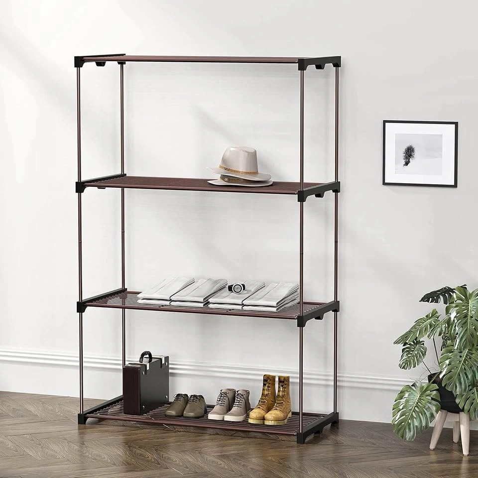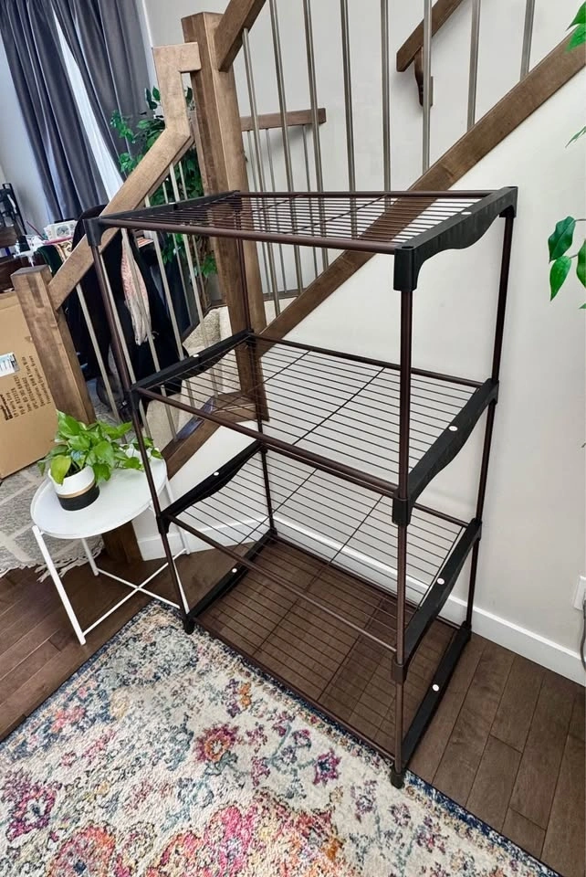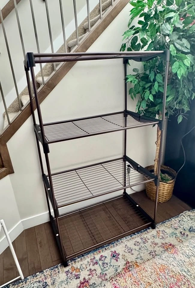 Wide wire shelves offer plenty of room for clothes, shoes, bags, and household items. Easy to place in closets, bedrooms, garages, laundry rooms, or entryways. Assembles quickly with no drilling or power tools needed. Classic bronze metal frame with sturdy plastic end connectors for a clean, cohesive look. Measures approx. 31" W x 19.5" D x 51.5" H — great for maximizing vertical storage. Strong metal construction holds everyday items securely and keeps spaces organized.