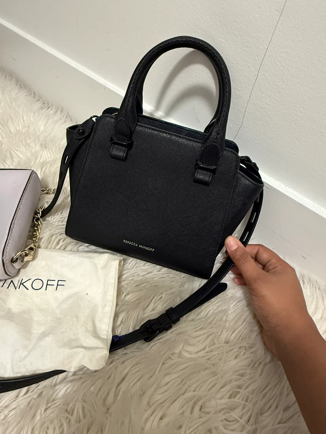 Two stylish Rebecca Minkoff crossbody bags up for grabs! One is a sleek black mini tote with a top handle and crossbody strap, perfect for everyday use. The other is a chic lilac crossbody with gold chain detailing. Both in great condition and ready to elevate your style!