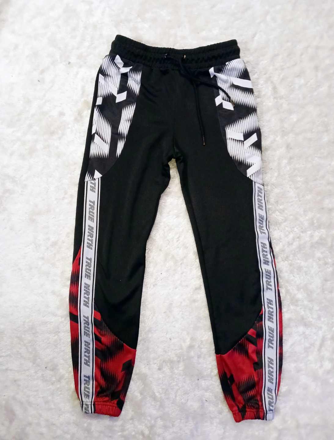 Selling a pair of True Noth joggers in black and red. They're in great shape and ready for a new owner! The design features a unique pattern with the words 'TRUE NRTH' along the sides.