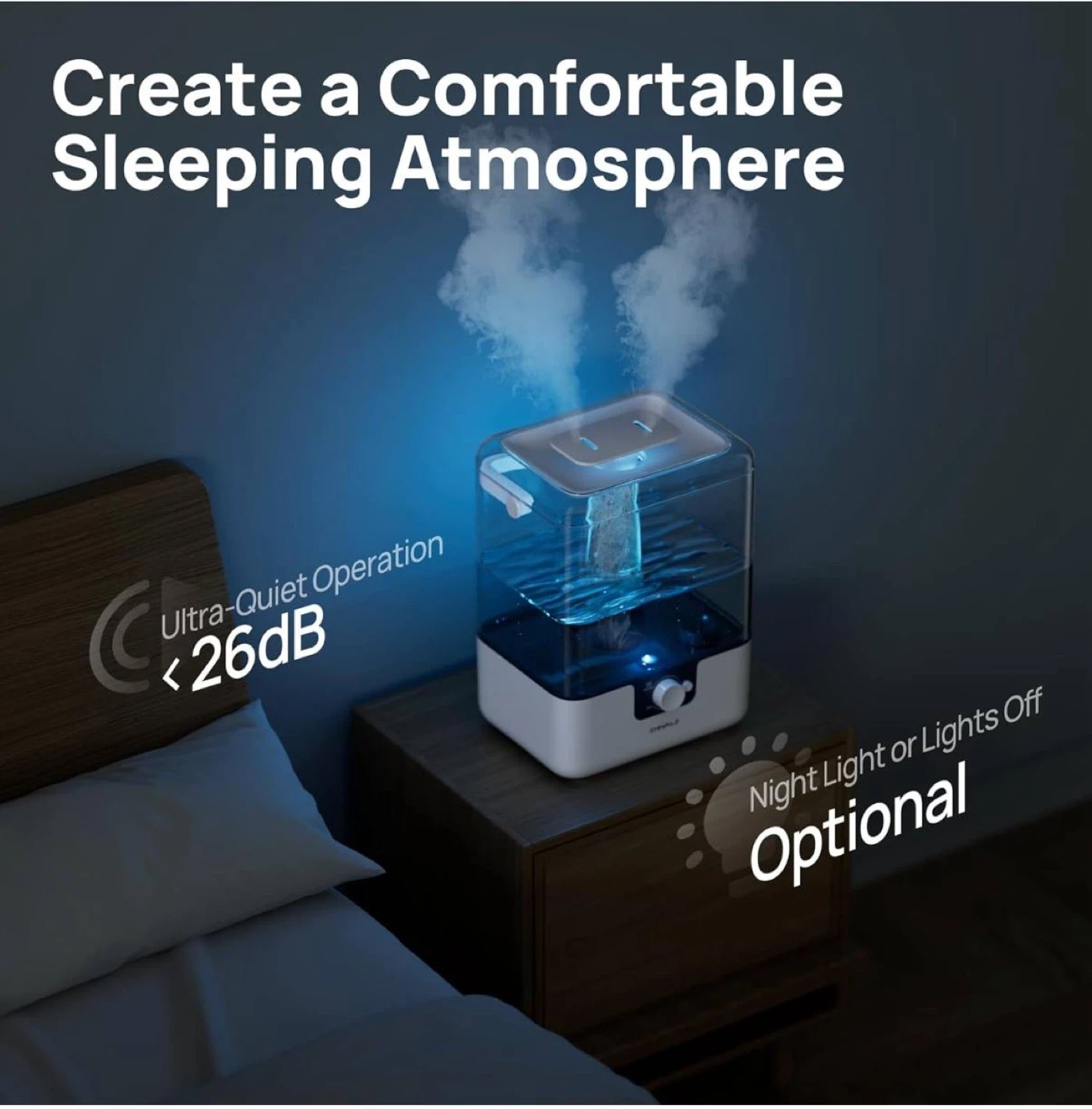 Looking to add some moisture to the air? This humidifier has a large 6L tank and can quickly create mist in just 5 seconds! It offers coverage for up to 538 square feet. Plus, it operates ultra-quietly, below 26dB, so it won't disturb your sleep. You can even enjoy aromatherapy by adding your favourite essential oils!