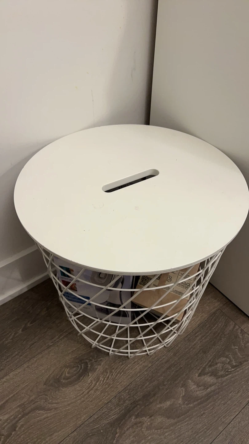 Selling a cute white wire basket table! It has a wooden lid with a slot, perfect for storing things inside while still having a functional surface. Great for a small space or as a side table