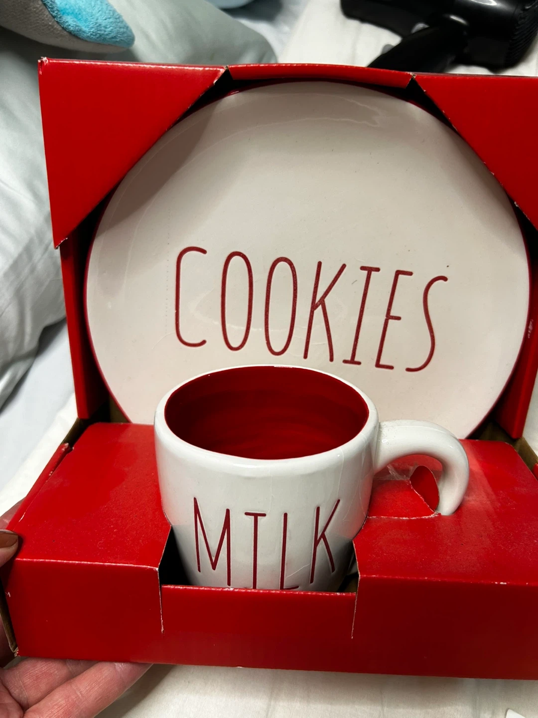 I'm selling a Rae Dunn plate and mug set! The plate says "COOKIES" in red lettering, and the mug says "MILK" also in red. It comes in the original box. Originally bought for $14.99