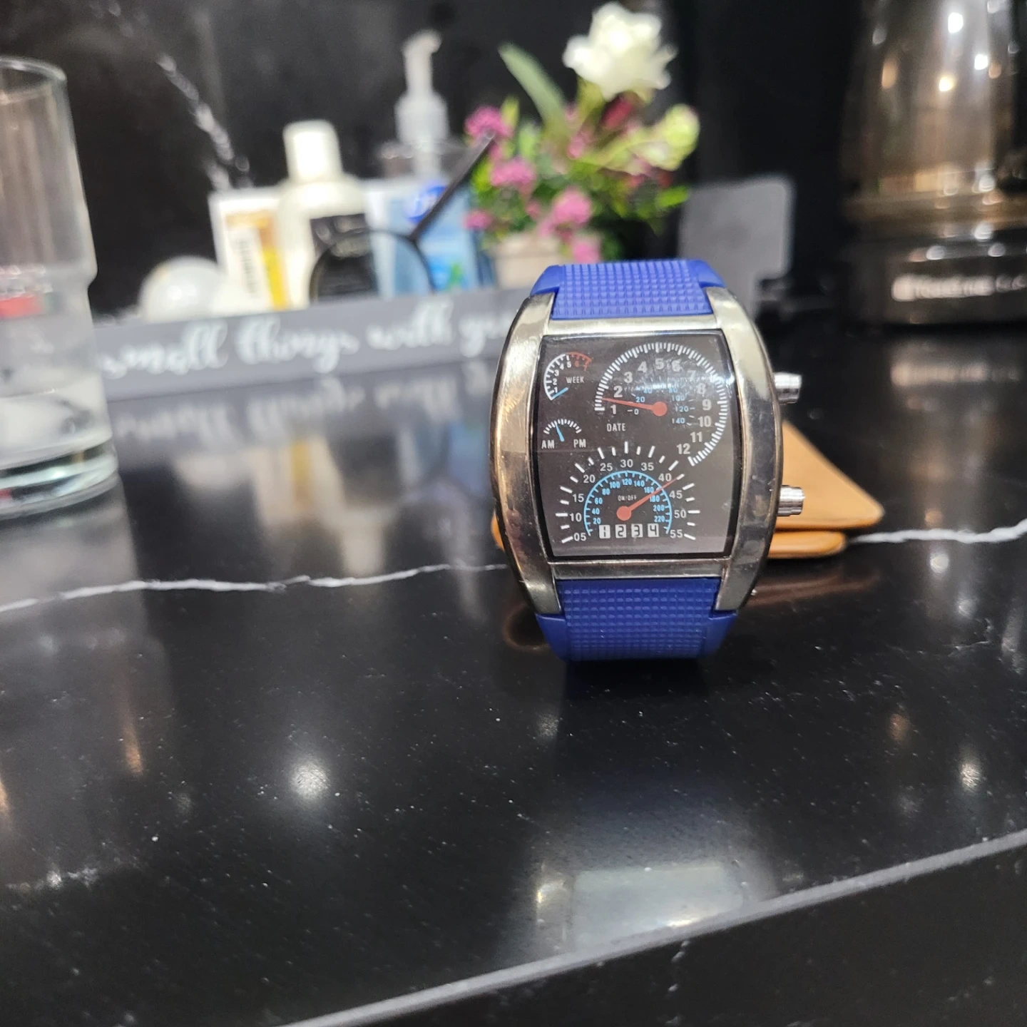 Selling a collection of rings, necklaces, a watch with a blue band, and a belt buckle. They are in good condition and ready for a new owner!