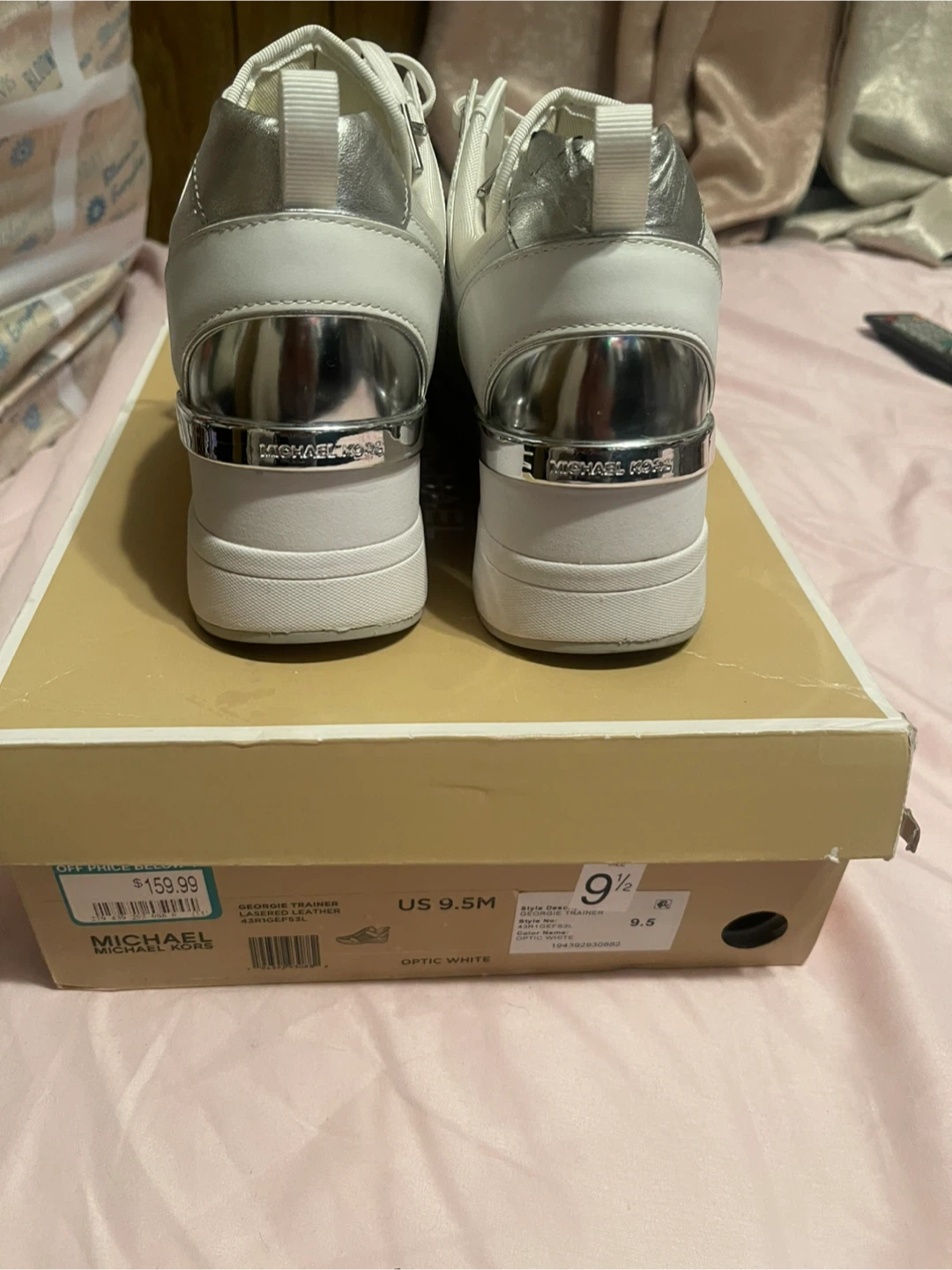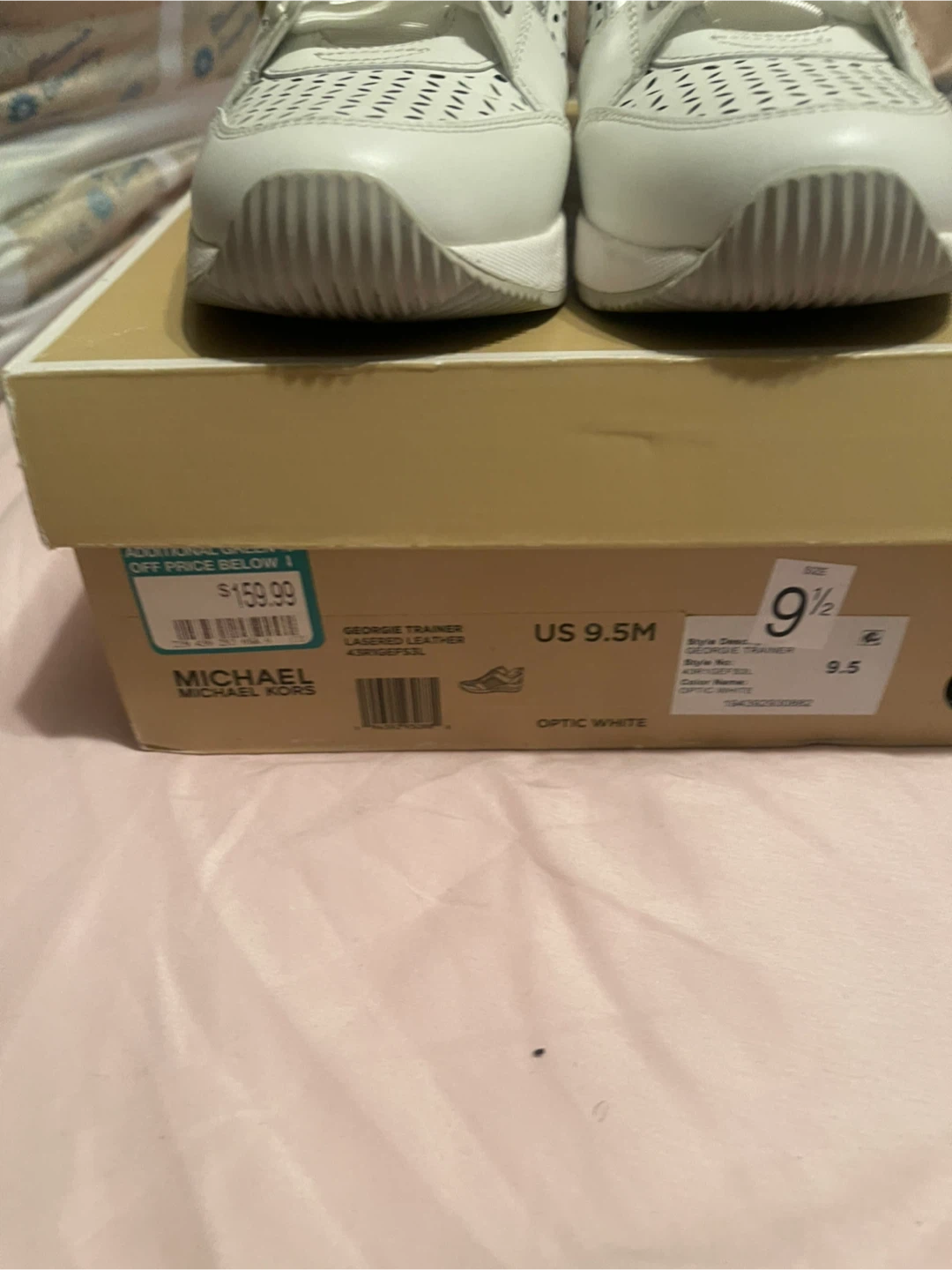 Selling a pair of Michael Kors Georgie Trainer sneakers in US size 9.5. They are optic white and come with the original box. These are leather sneakers with a laser-cut design. Originally bought for $159.99