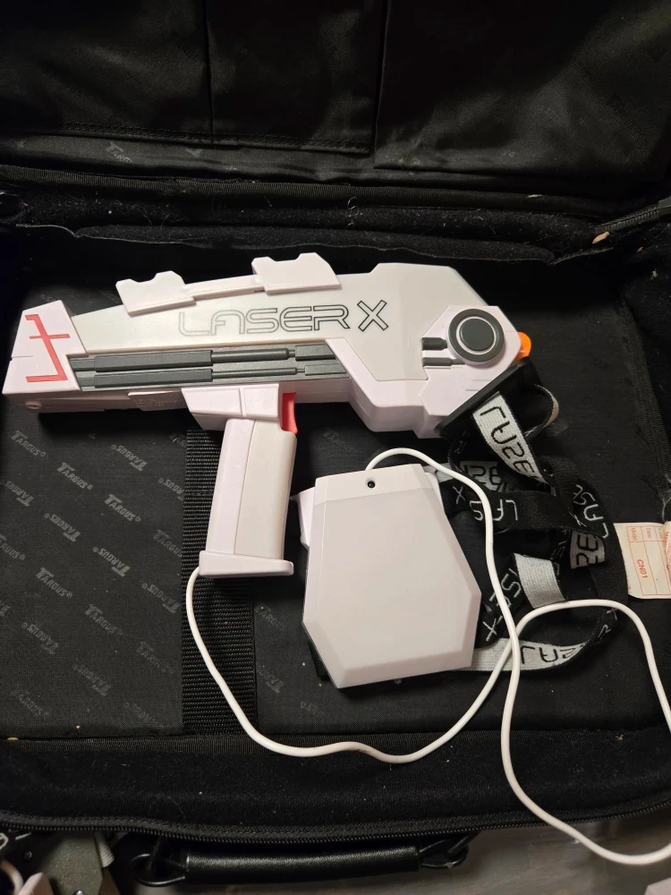 Get ready for some fun with this Laser X 4 -player laser tag set! It comes with 4 gaming blasters and a bag so you can challenge a friend or family member to an exciting match. The blasters are in great condition and ready for action. Hours of fun for kids and adults! Used once