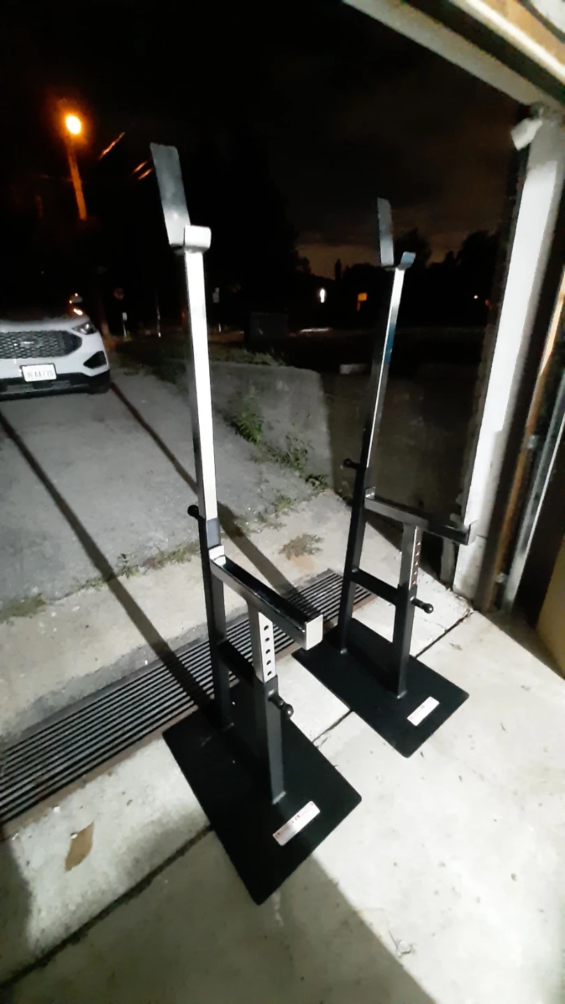 Selling a pair of PB 820 Step Squat Racks by Unofive. They're in New condition and ready for your home gym! These squat racks are sturdy and reliable, perfect for various exercises. They have adjustable height settings from 55-100cm and a width of 30cm. The base measures 70cm x 75-120cm. Originally bought for $584.99 CAD.