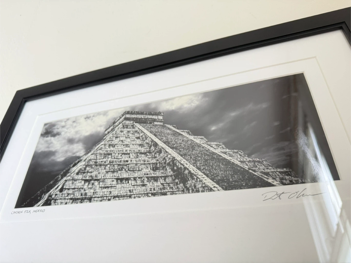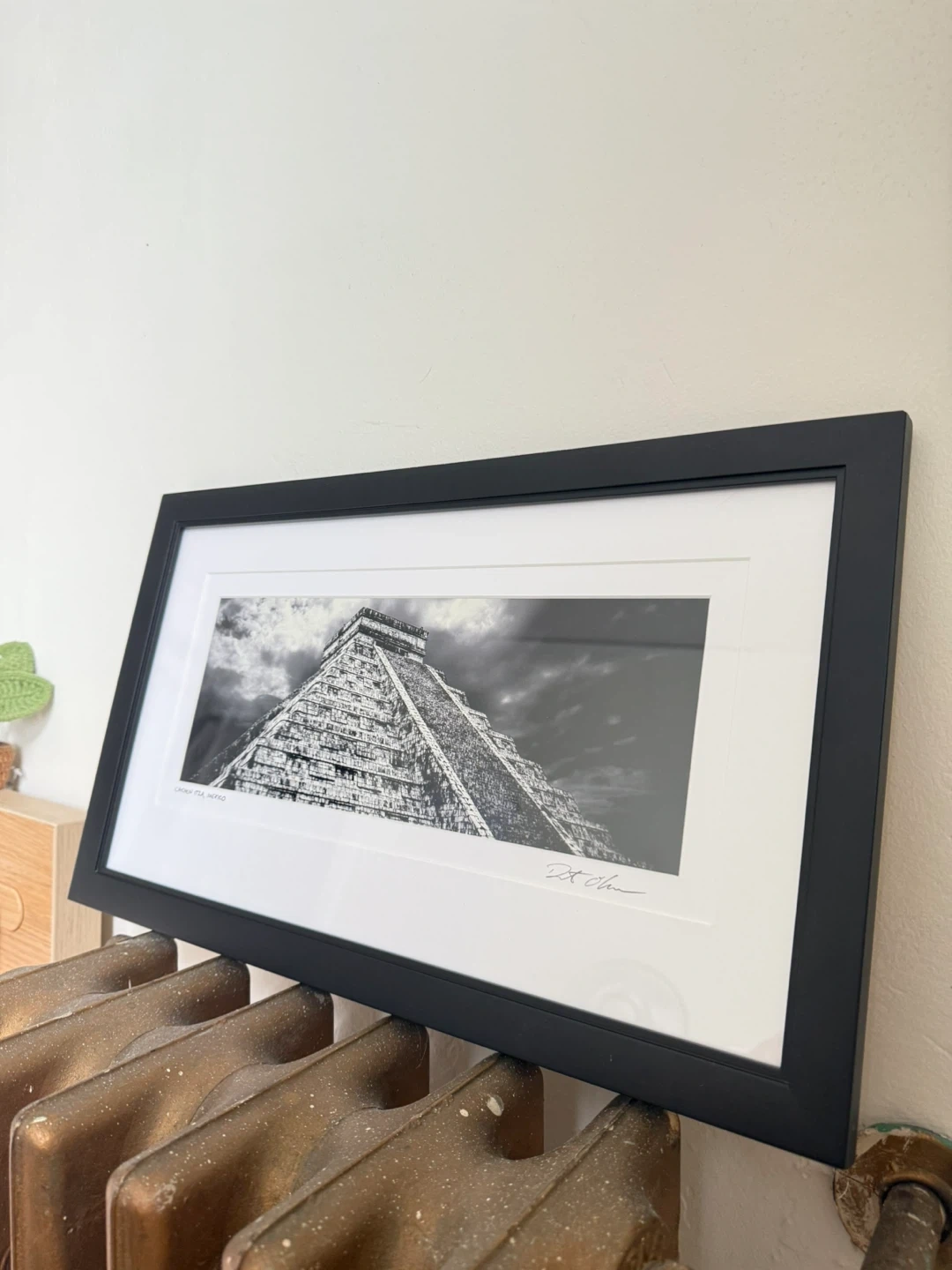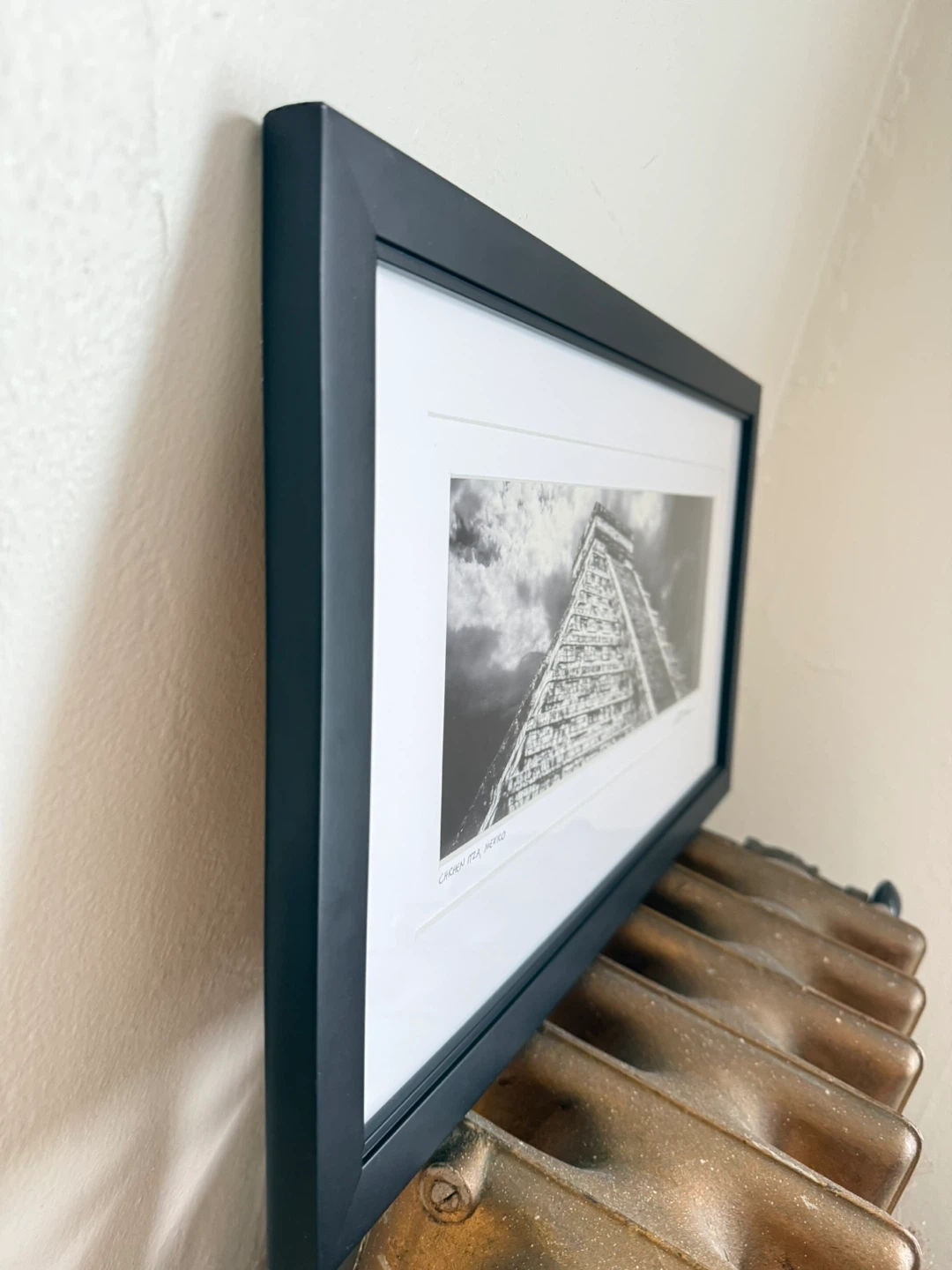 Black and white photograph of Chichen Itza in Mexico 🇲🇽 set against a cloudy sky, in custom framing (black frame, white matte) and signed by the photographer.