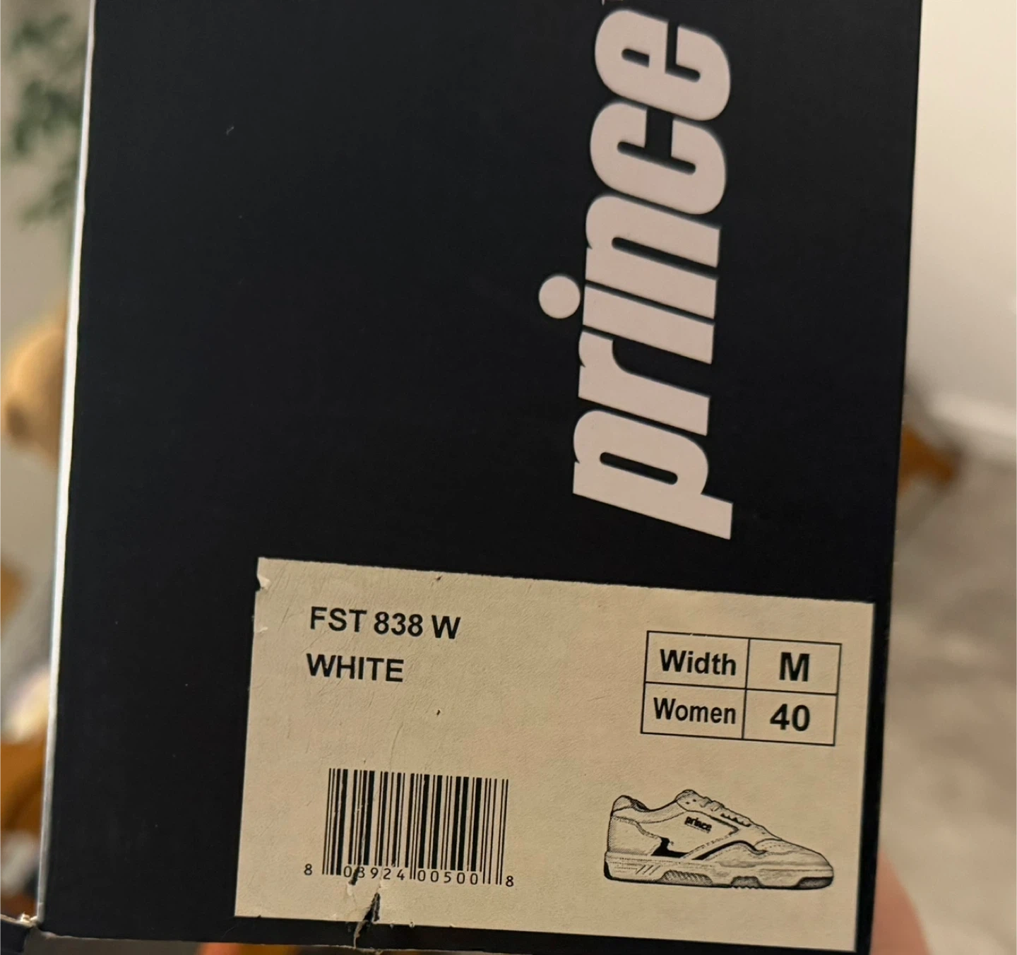 Selling a pair of Prince FST 838 W tennis shoes in white. They are women's size 40. The shoes come with the original box.
